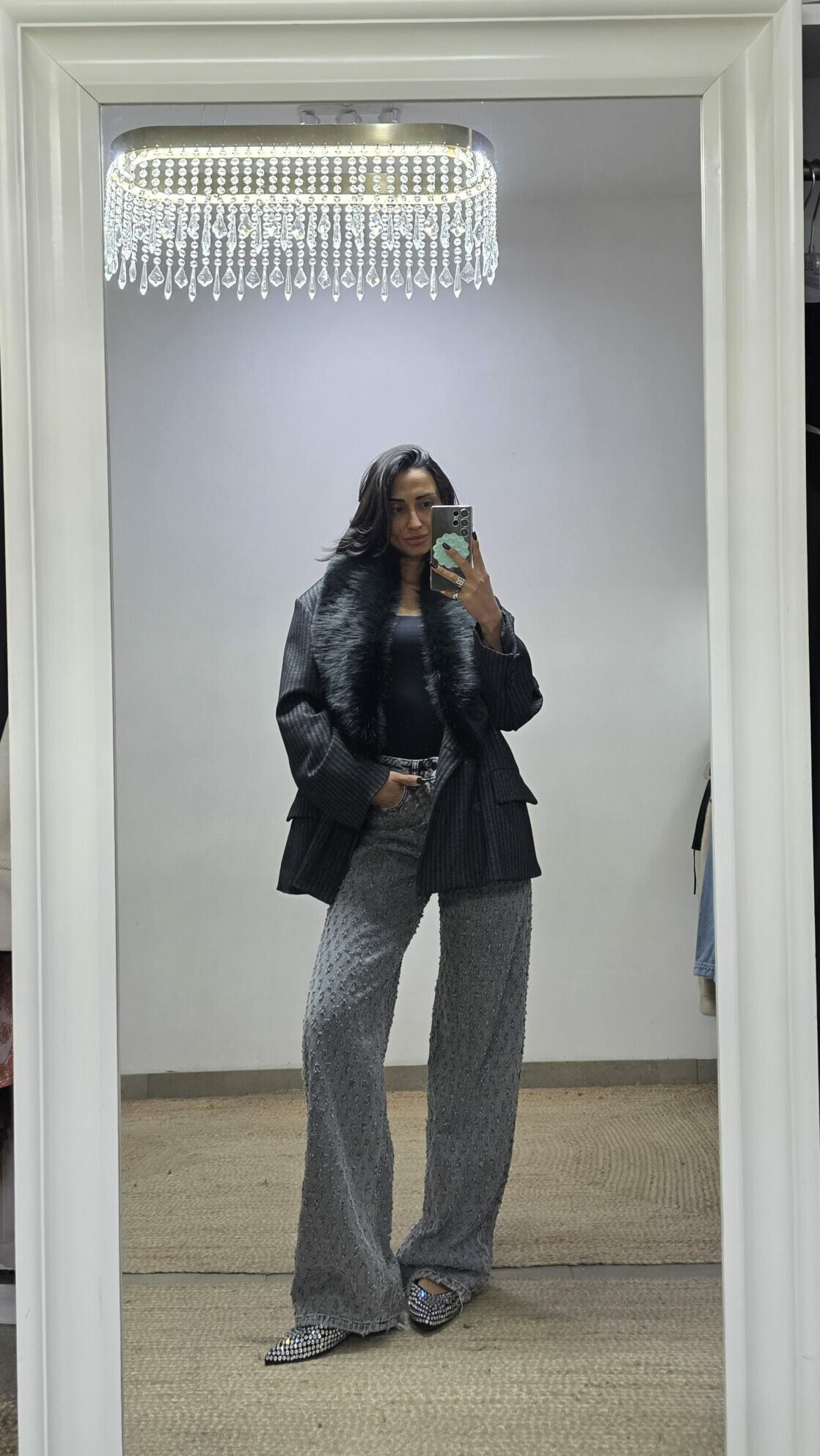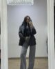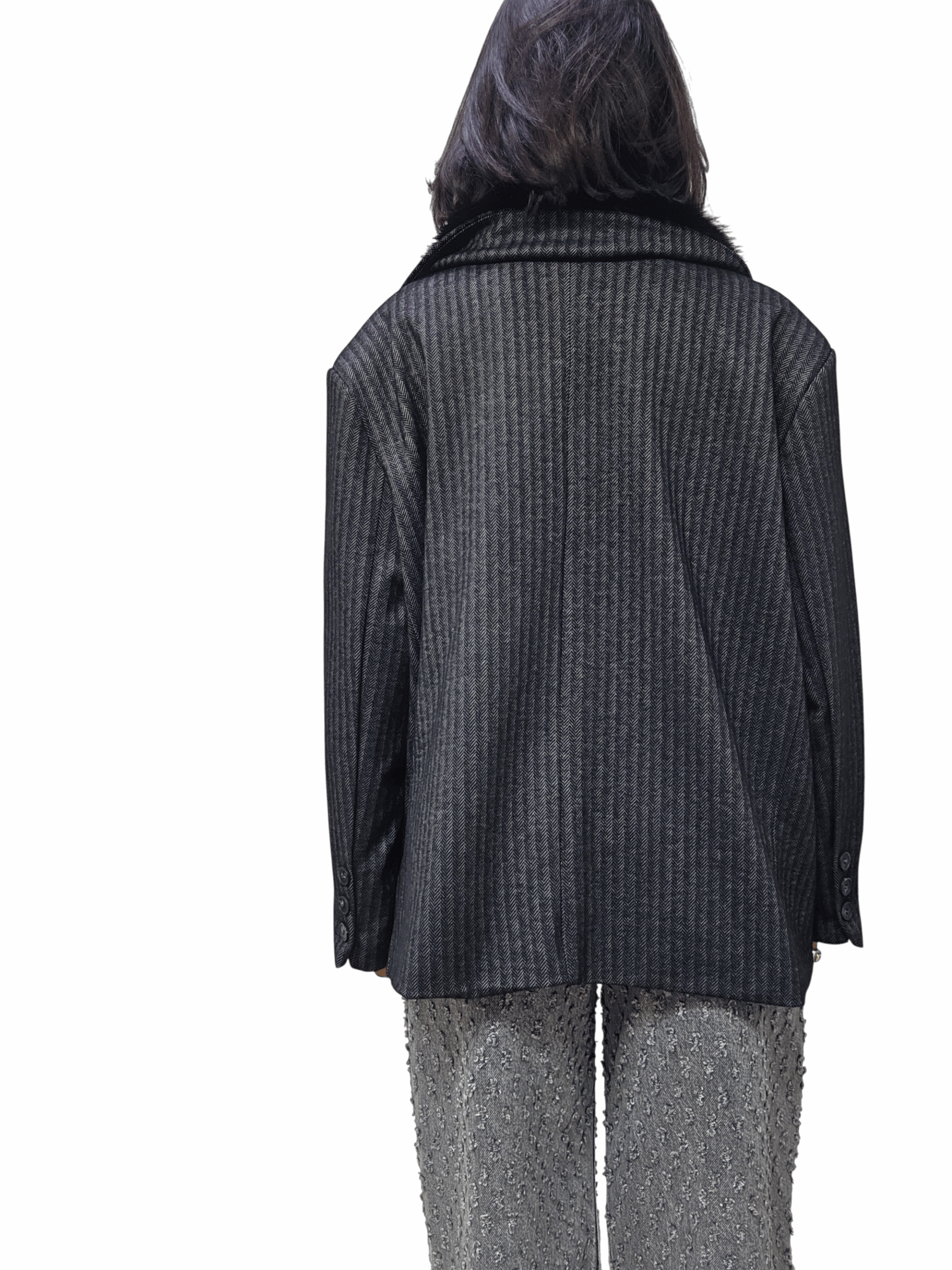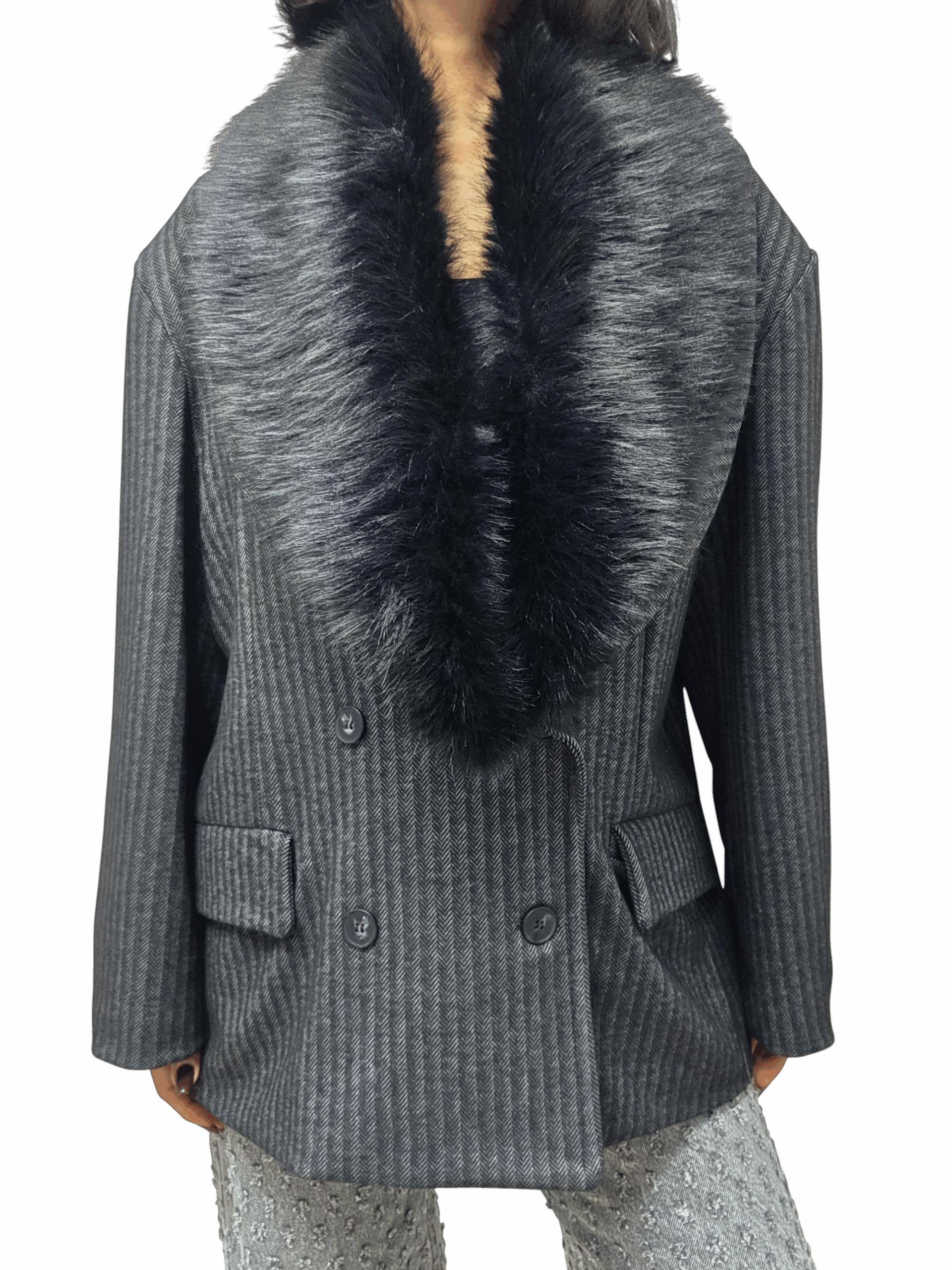 Blazer dal fit over con spalline e chiusura doppio petto. Collo in ecopelliccia removibile . Vestibilità over, lunghezza media. Fodera interna. Taglia unica adatta a vestire fino a una taglia 48. Piccolo gessato. Blazer perfetto per look cool e chic.