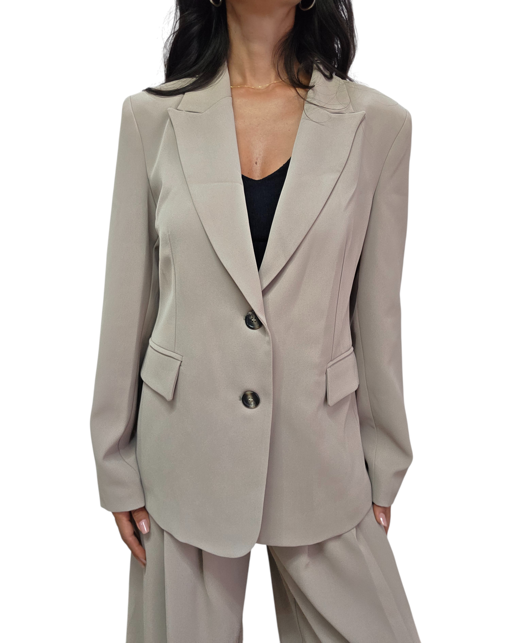 Blazer dal taglio leggermente avvitato con chiusura con due bottoni. Spalline e tessuto fluido e non elasticizzato. Fodera interna . Vestibilità regolare con lunghezza media. Brand Please, made in Italy. Blazer must have adatto a look casual/chic e da ufficio.