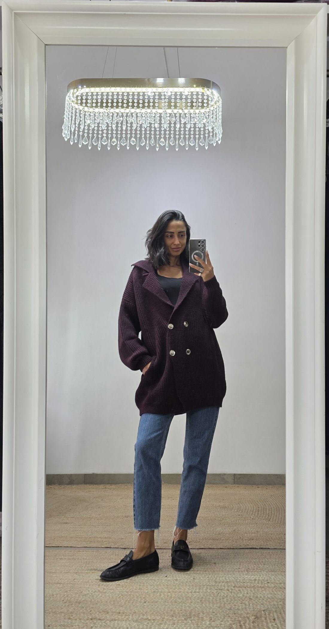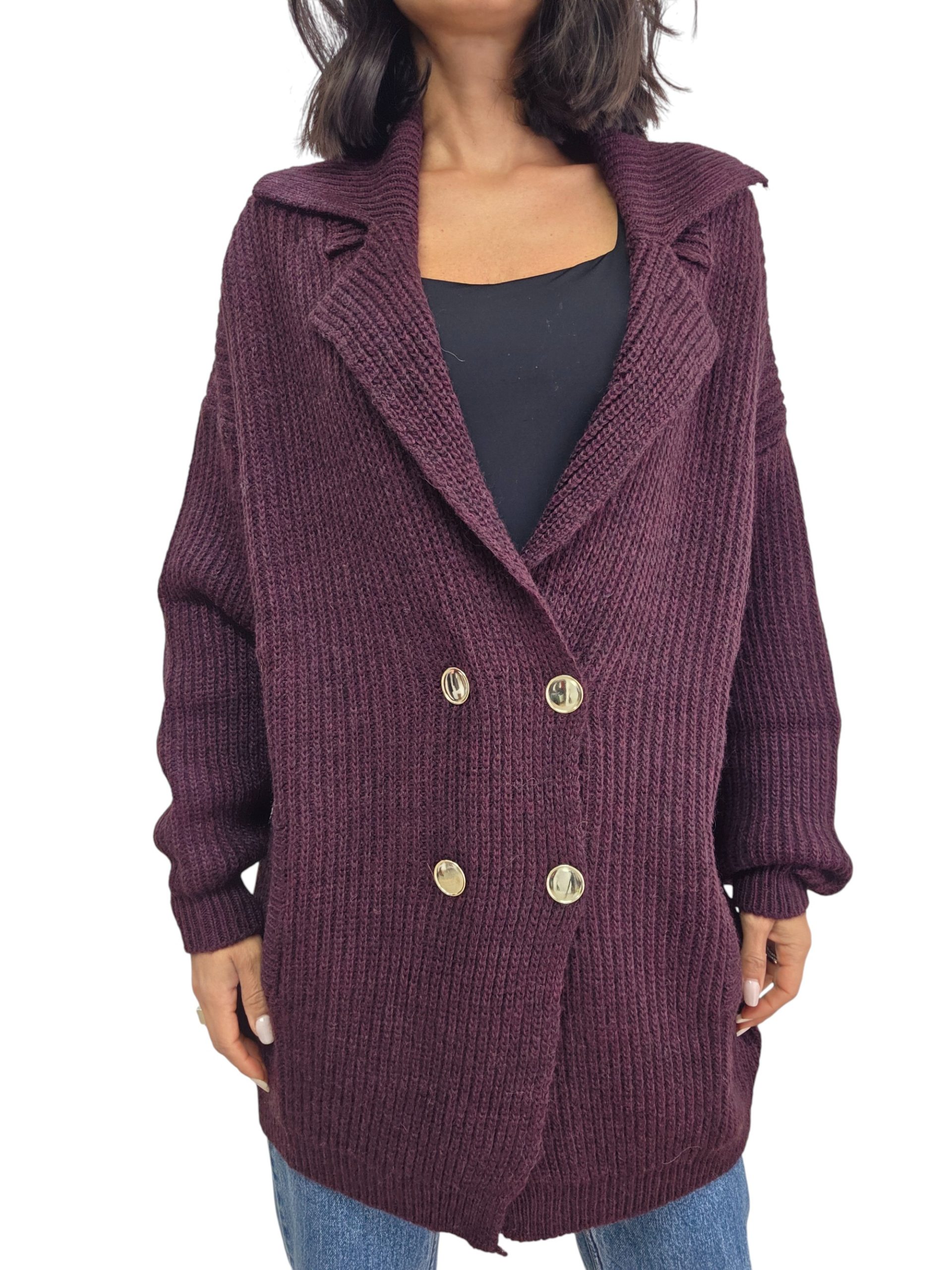 Giacca cardigan con chiusura doppio petto con bottoni oro. Vestibilità over con colletto e tasche, lunghezza medio/lunga. Taglia unica adatta a vestire fino a una taglia 48. Brand Kontatto, made in Italy. Caldo e avvolgente perfetto per l’inverno.