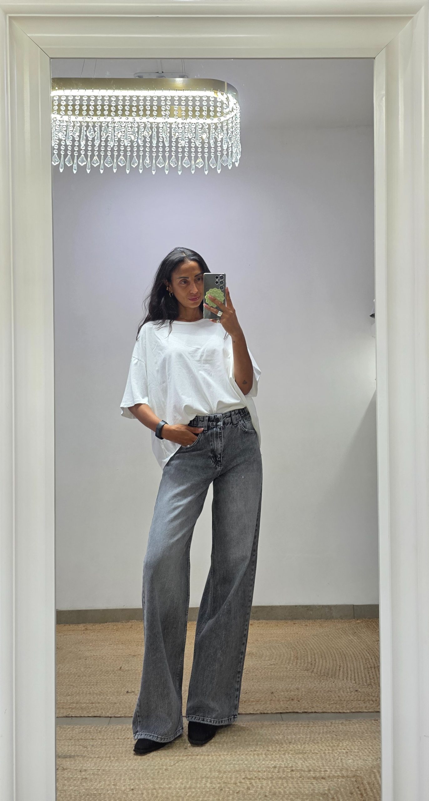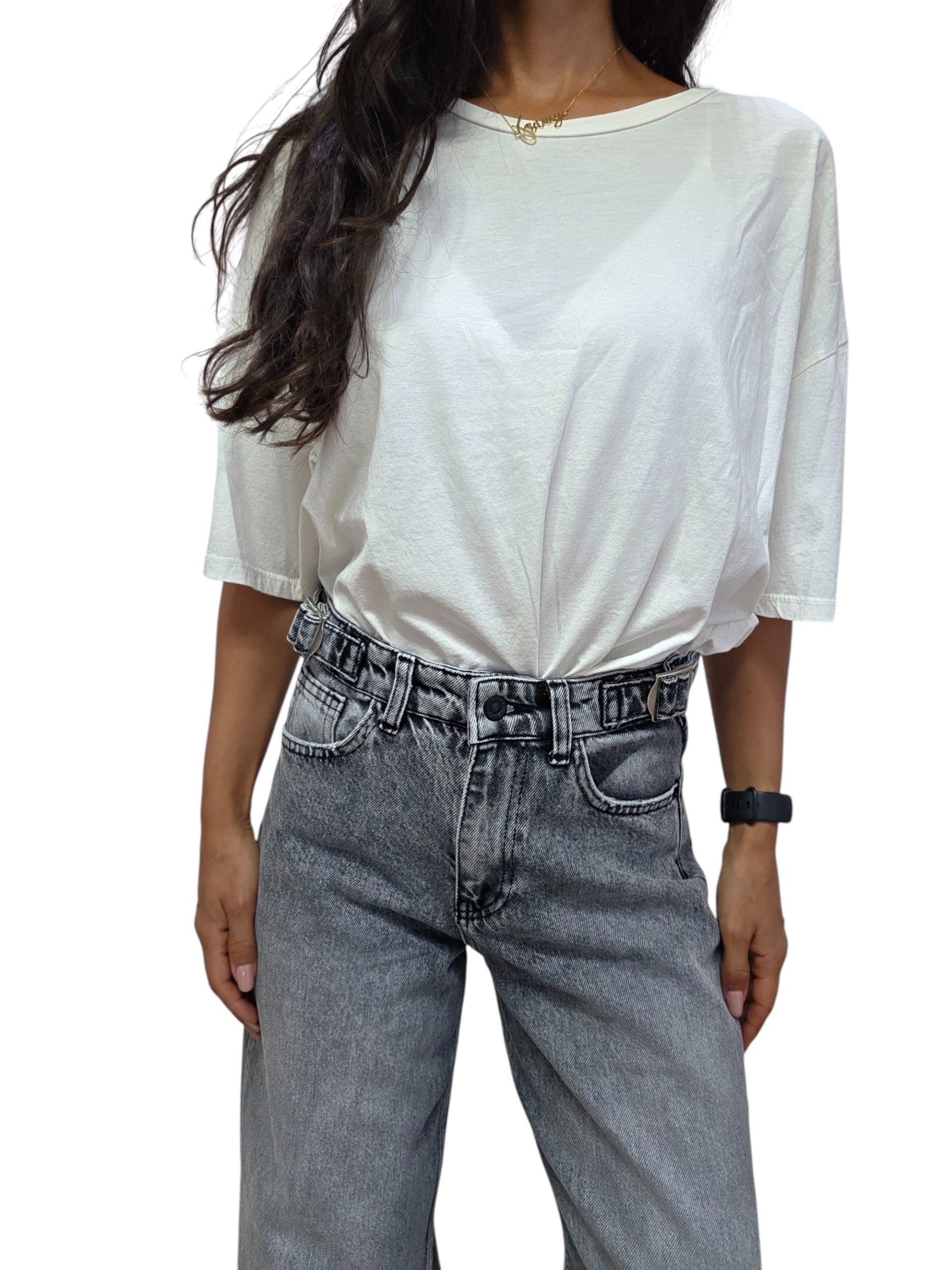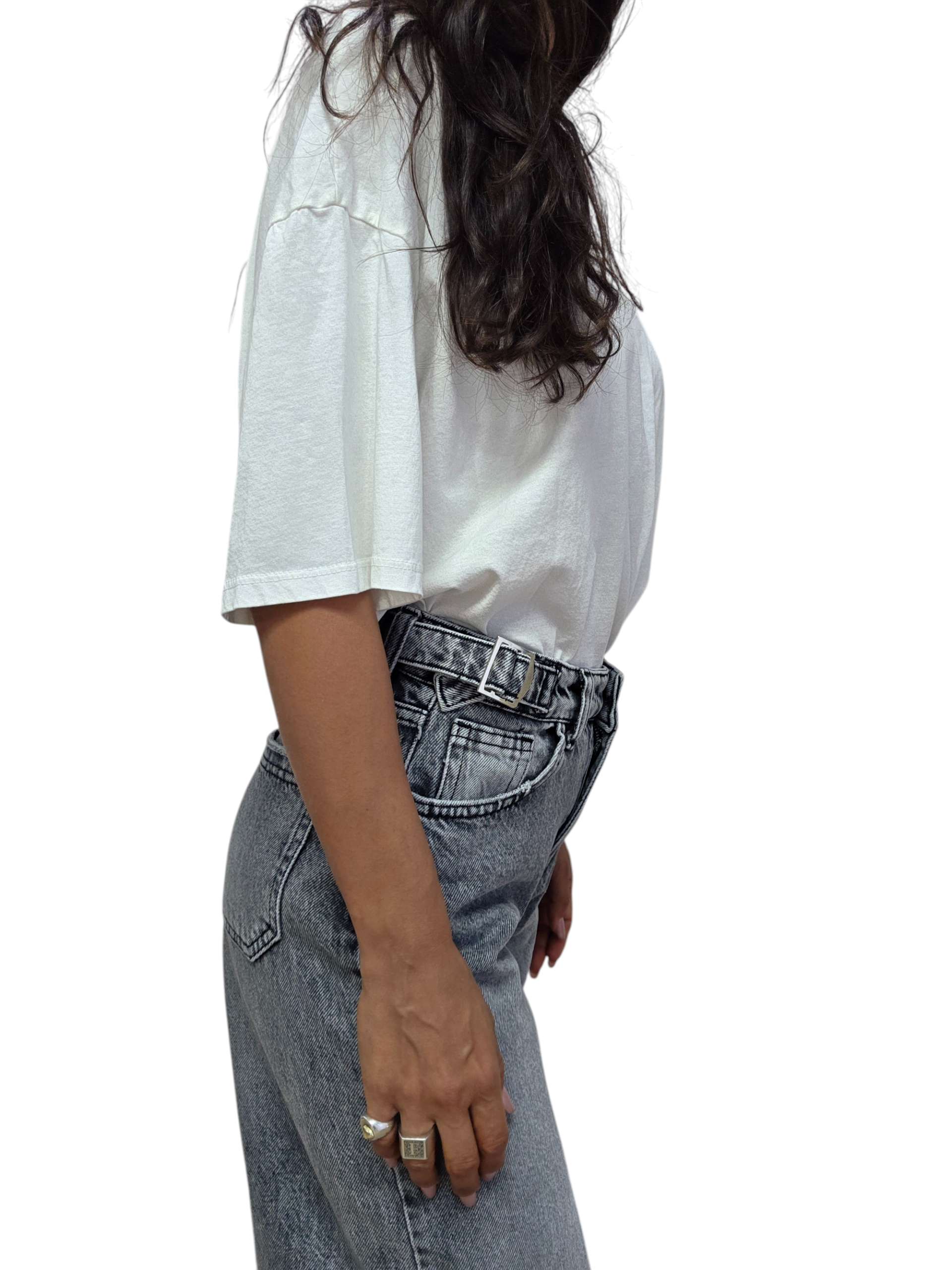 Jeans modello palazzo con gamba non eccessivamente larga. Vita regolare con cinta regolabile con applicazione ganci argento. Chiusura classica con bottone e zip. Tessuto fermo, non elasticizzato che tende ad ammorbidirsi portandolo. Vestibilità regolare. Brand Please, made in Italy. Jeans adatto a look casual e alla moda.