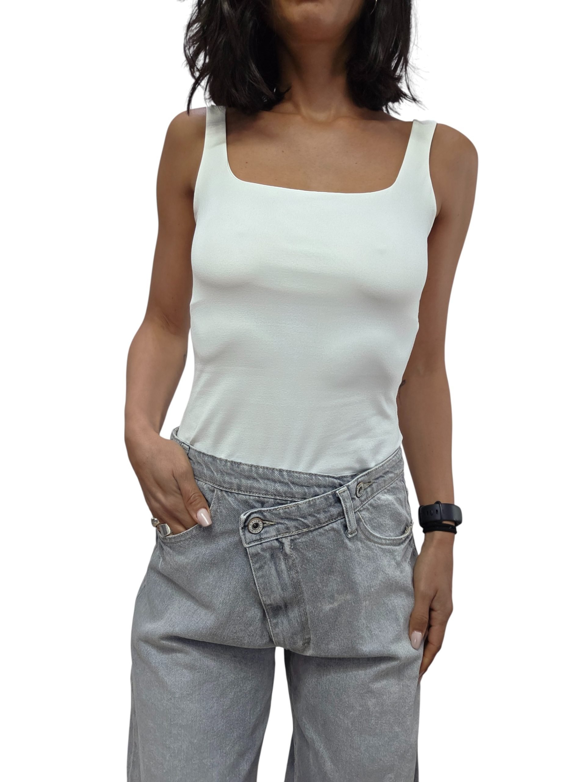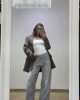 Jeans modello palazzo con tessuto leggero e comodo non elasticizzato. Chiusura con bottone e zip trasversali. Vestibilità regolare