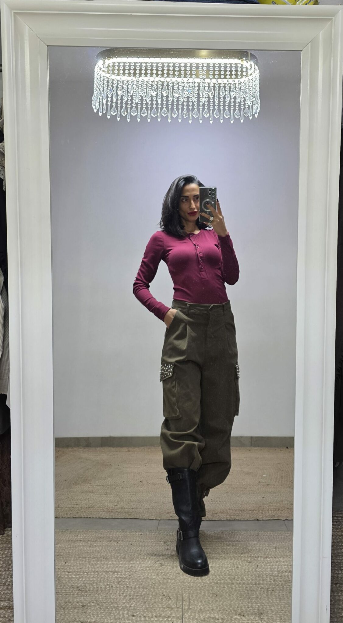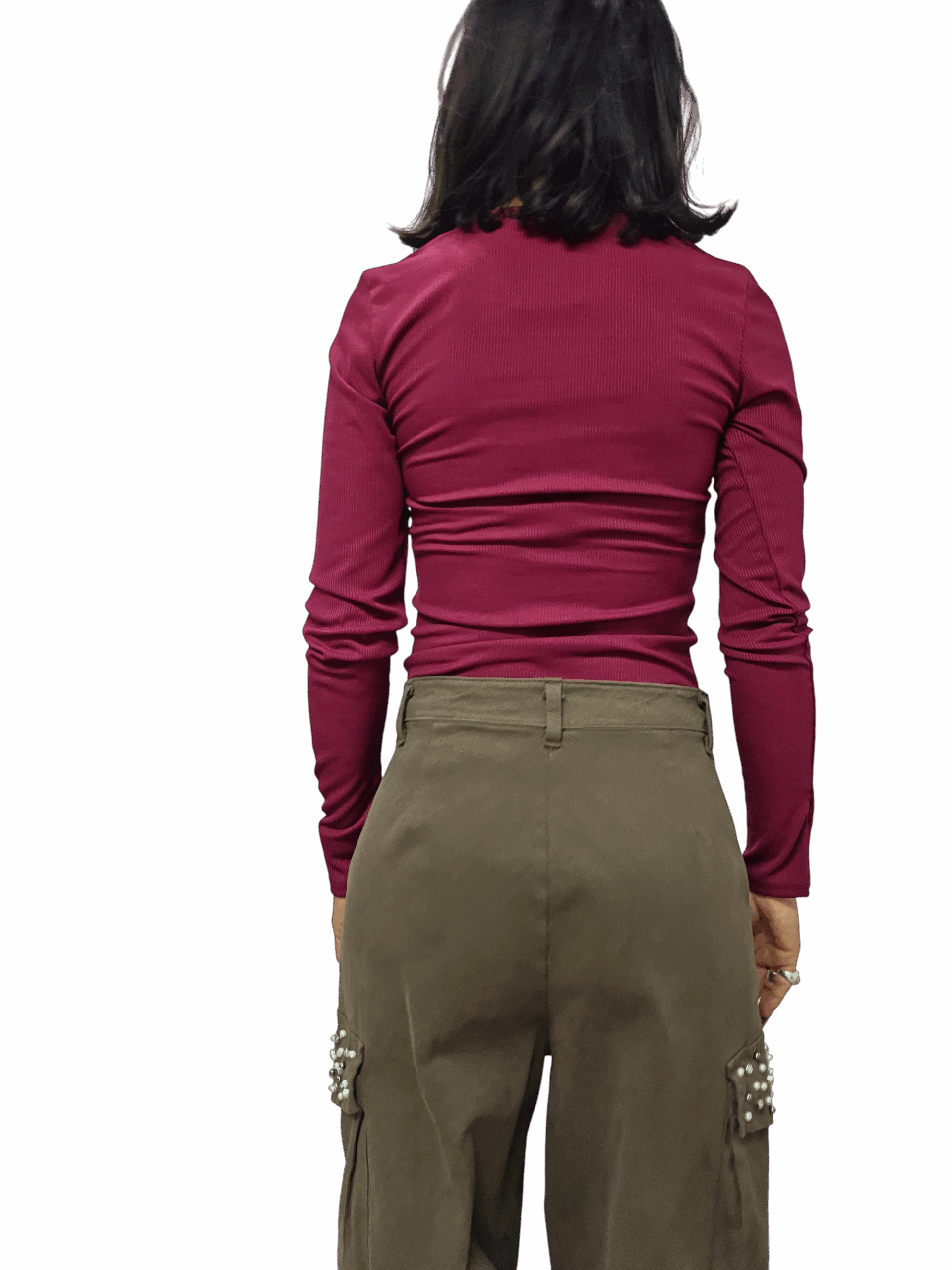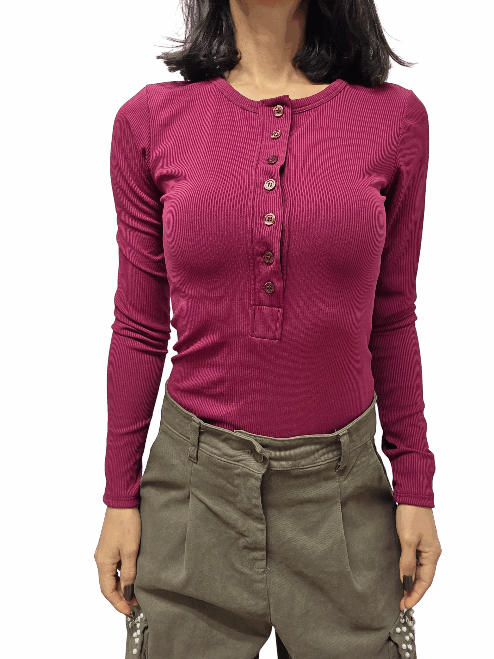 Body a costine con bottoncini, girocollo e fori per pollice sui polsi. Vestibilità aderente , taglia unica adatto a vestire fino a una taglia 48. Chiusura classica con clip. Comodo e perfetto da abbinare a look casual.