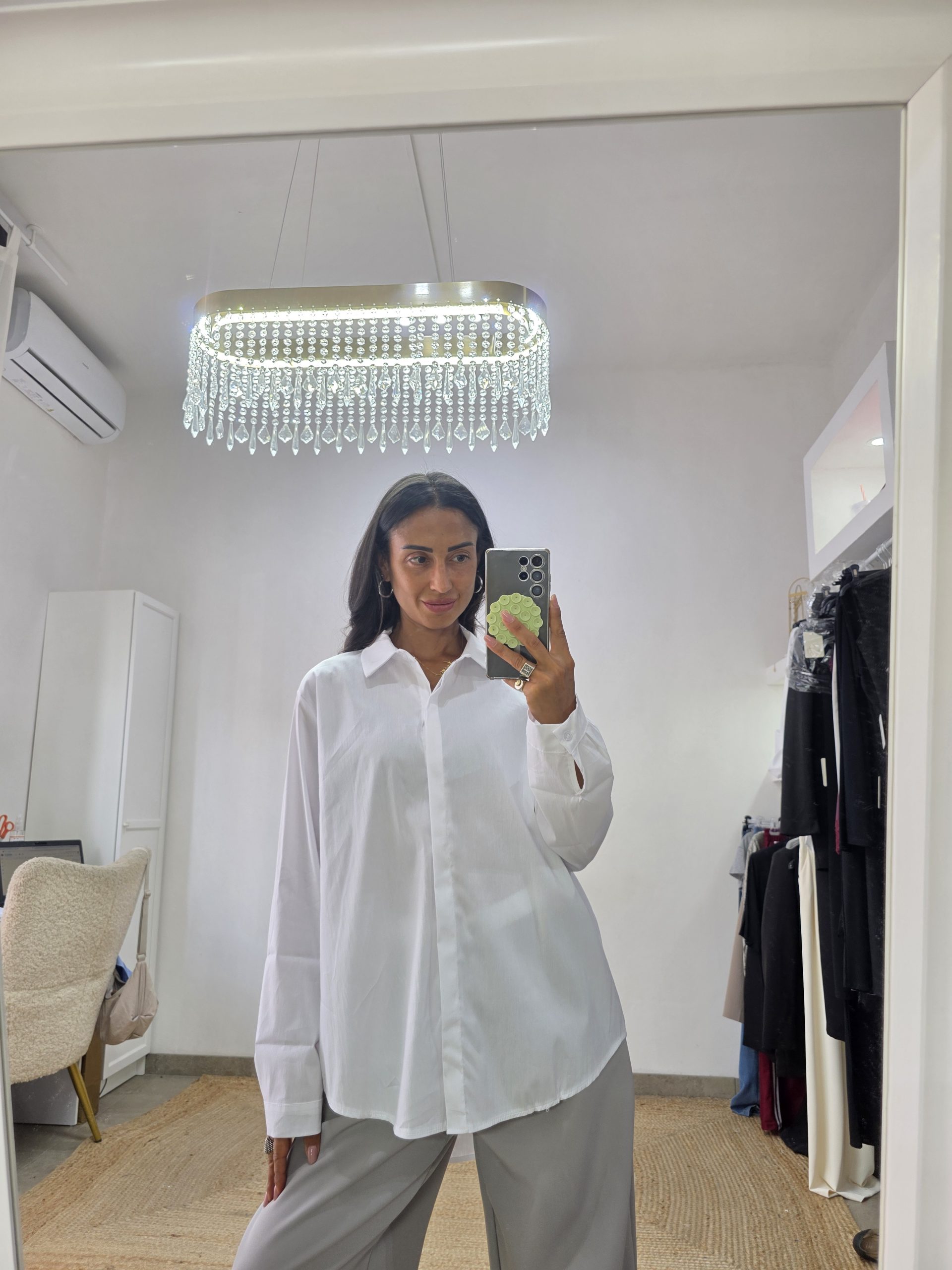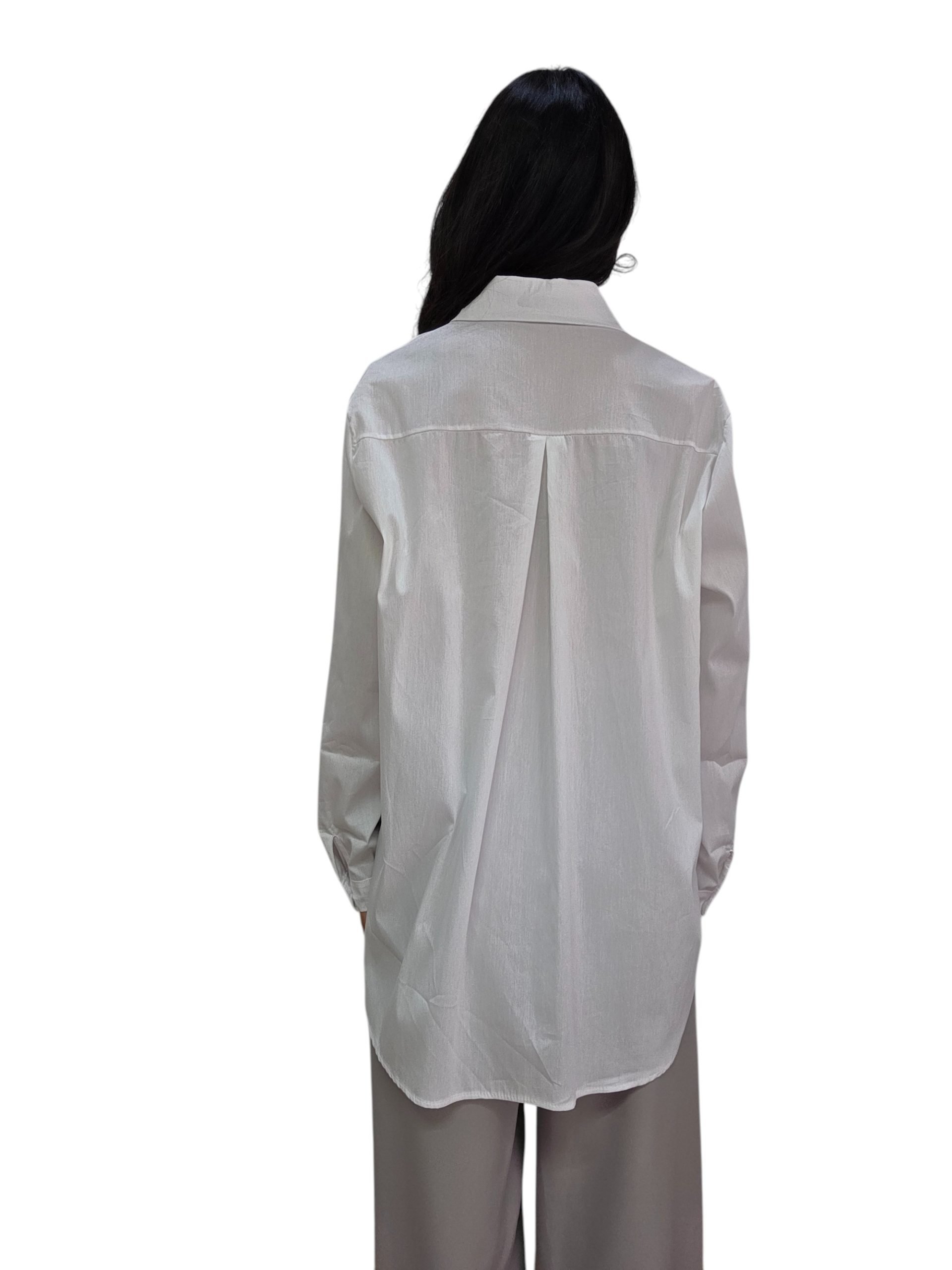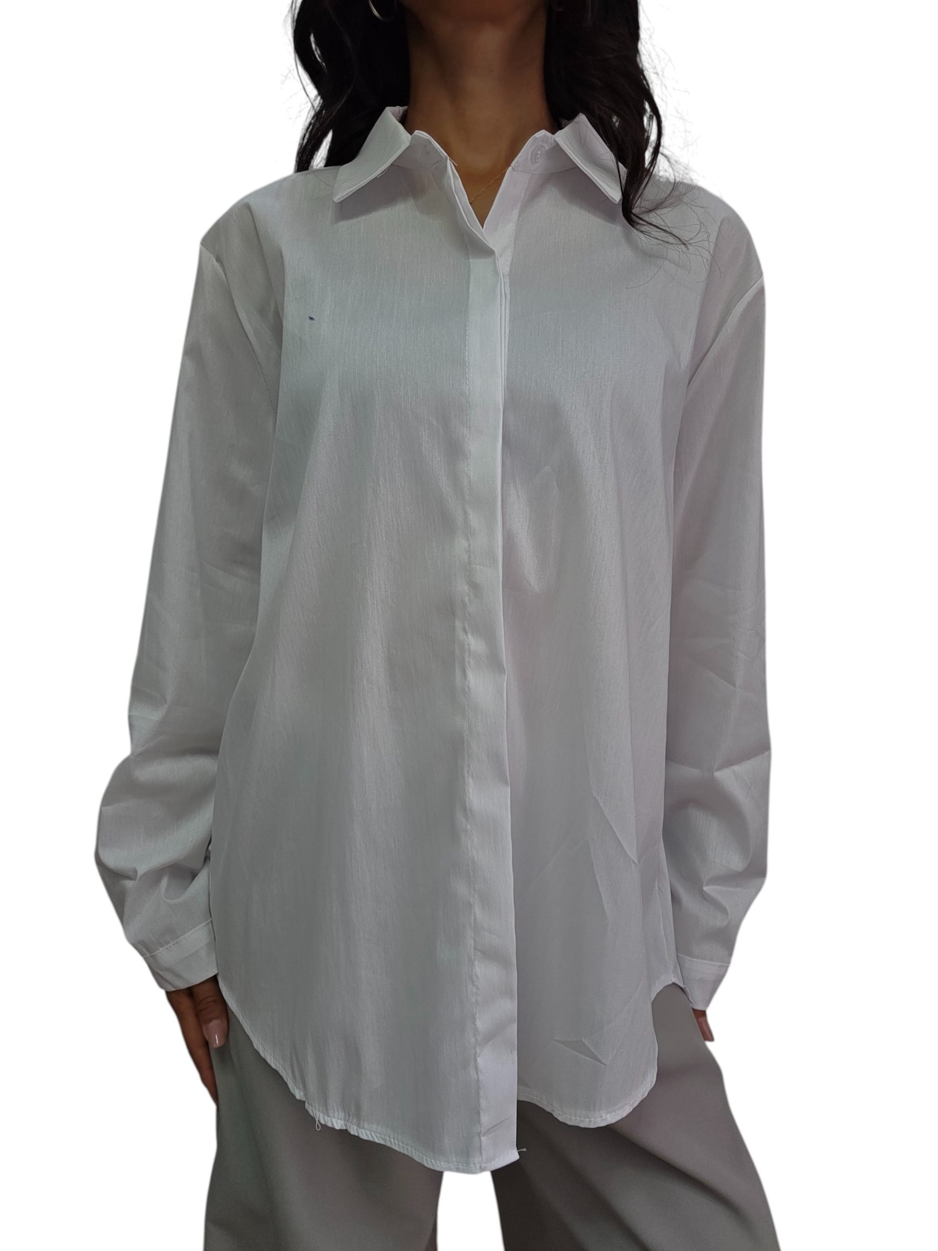 Camicia modello over con tessuto leggermente elasticizzato . Chiusura classica con bottoni più lunga nella parte posteriore . Taglia unica adatta a vestire fino a una taglia 48. Un vero bestseller da avere sempre nell’armadio.
