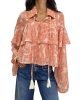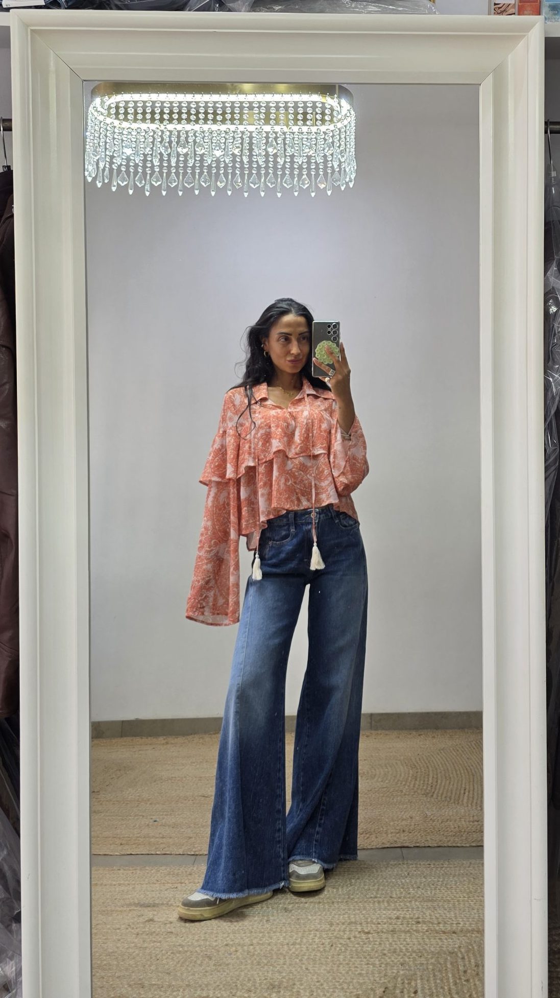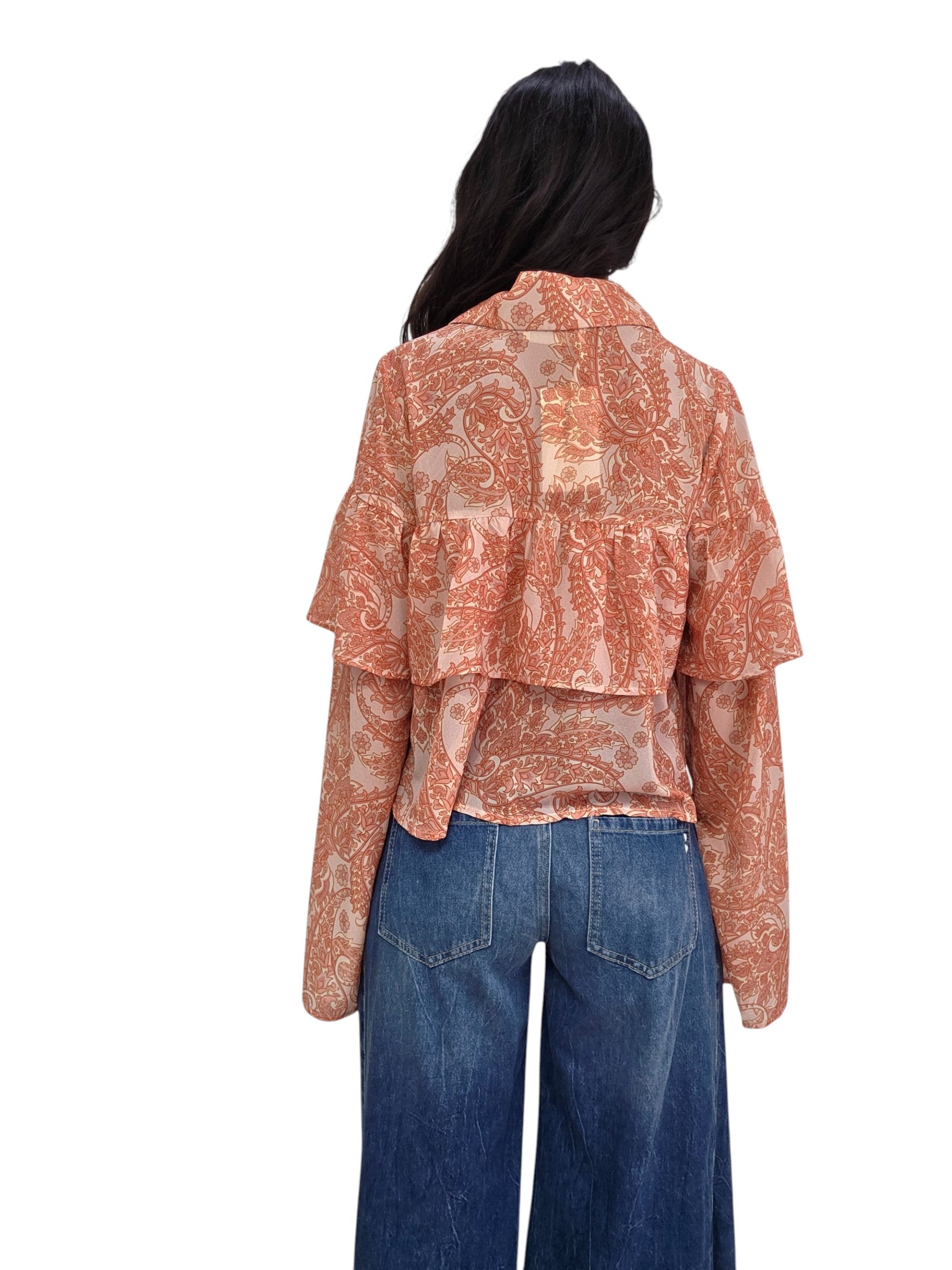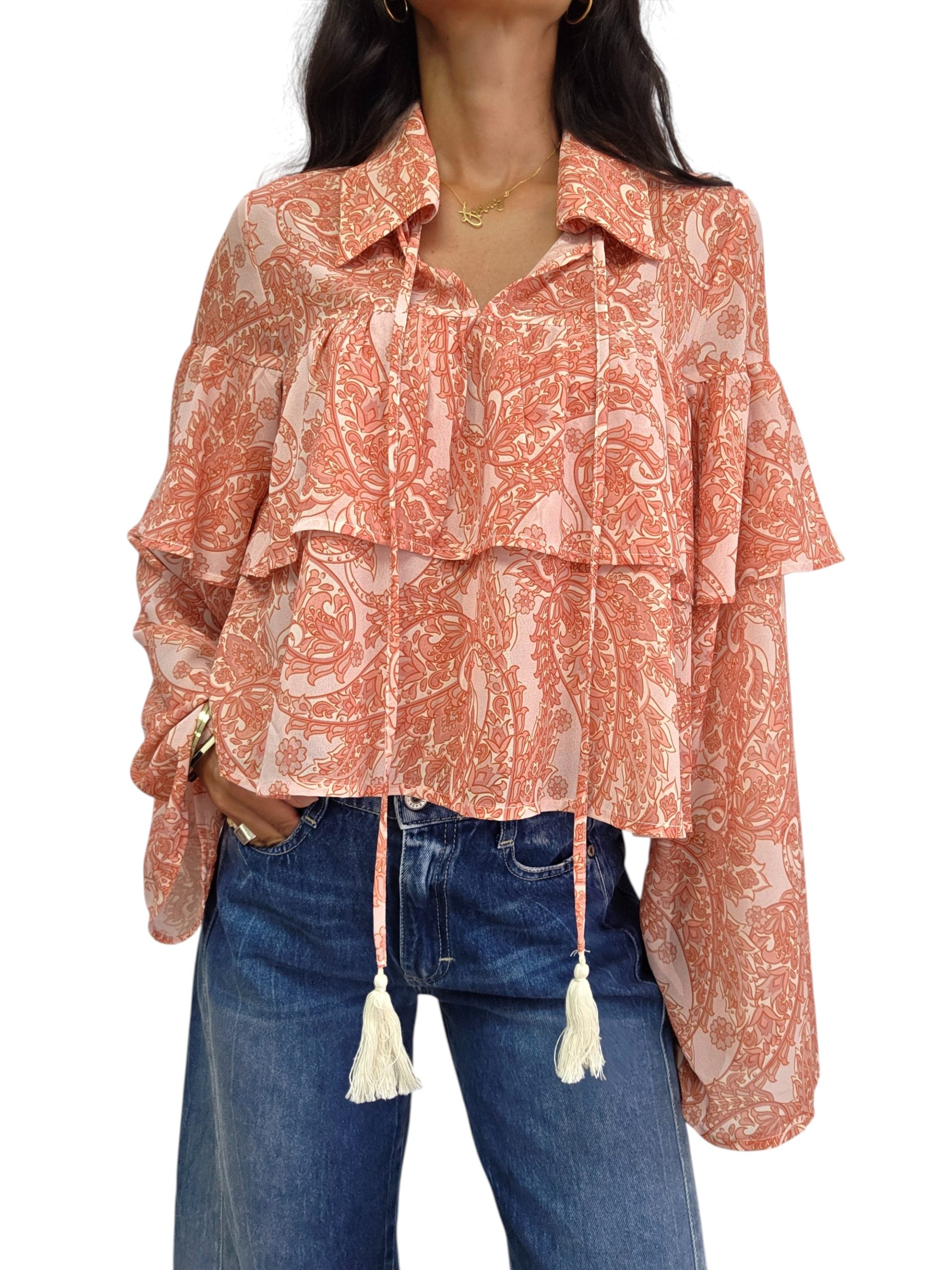 Blusa con balze, leggera scollatura a V con laccetti arricchiti con nappine. Lunghezza media, tessuto leggero non elasticizzato con vestibilità comoda. Fantasia. Brand Youdecide, ,Made in Italy