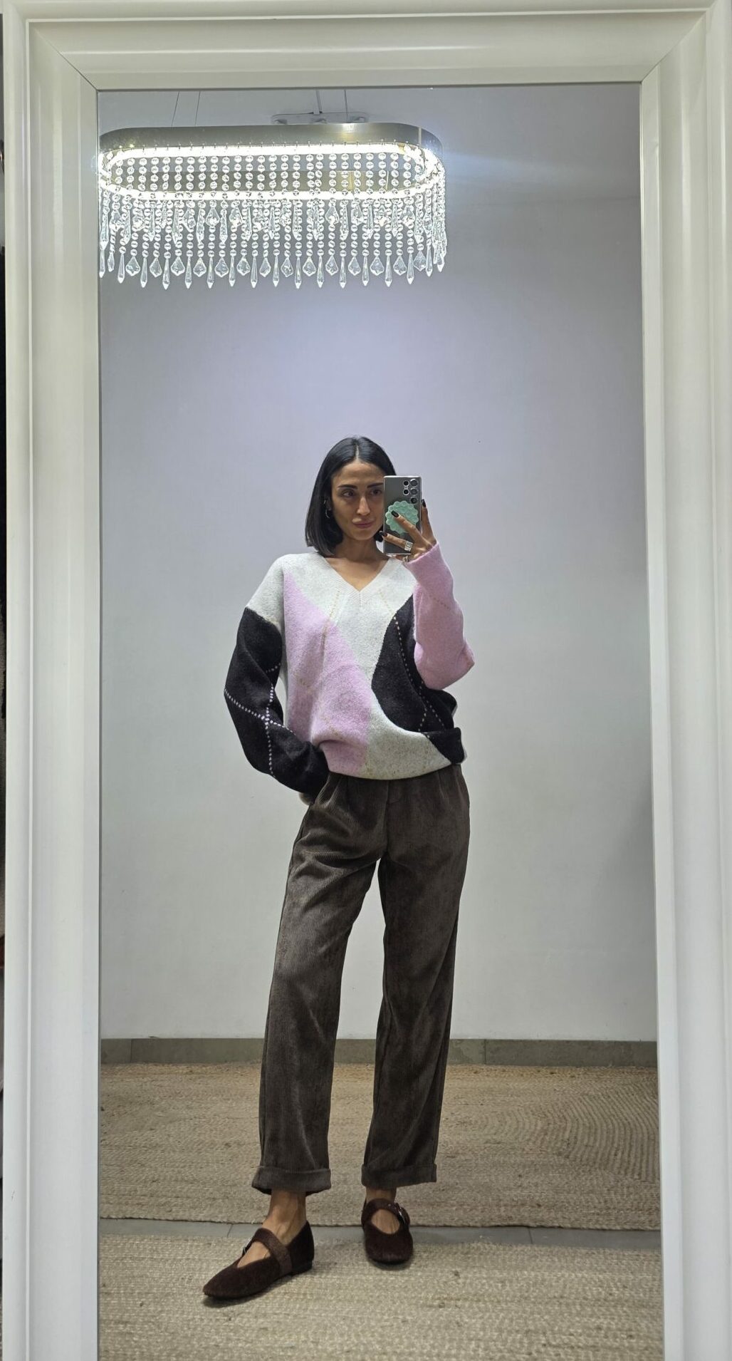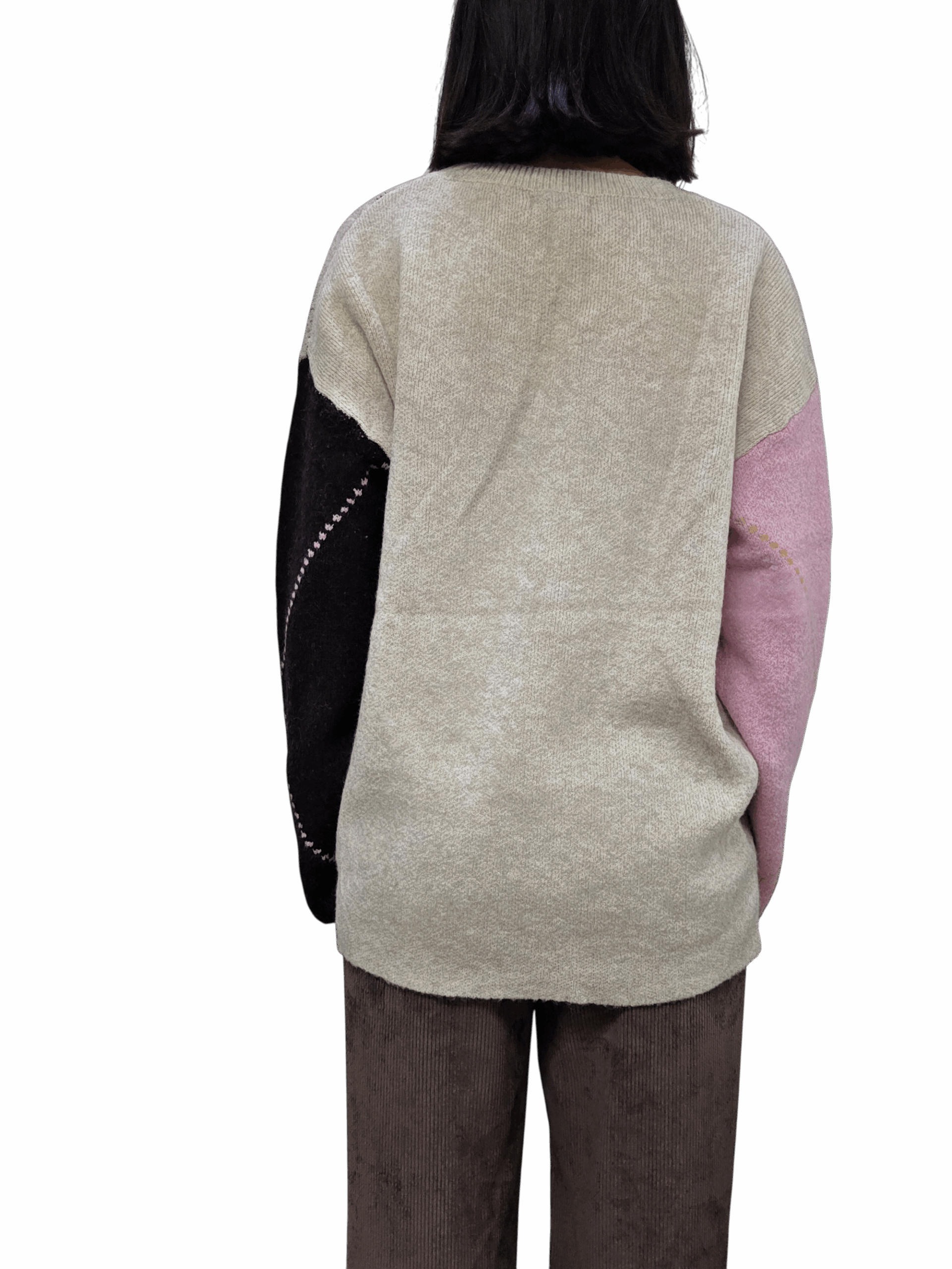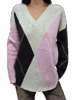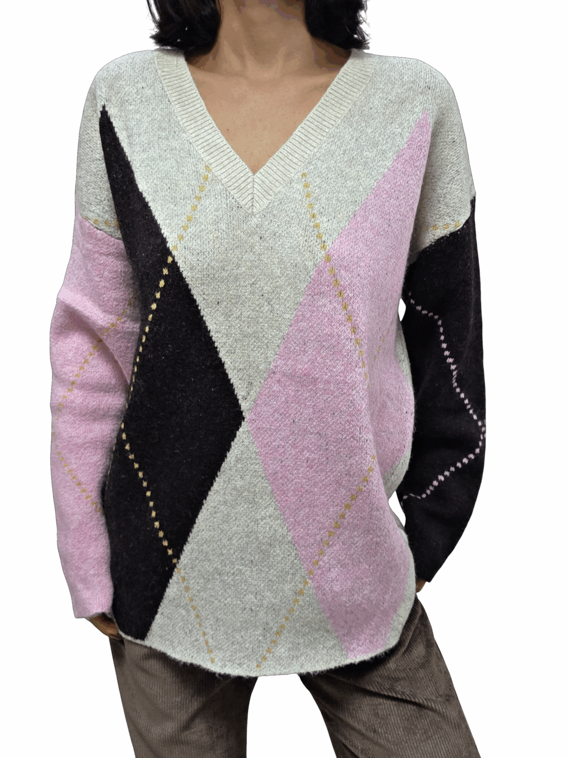 Maxi pull con stampa rombi. Scollatura a V e vestibilità over con lunghezza medio/lunga. Tessuto caldo e leggeremte elasticizzato, comodo e confortevole. Taglia unica adatta a vestire fino a una taglia 48. Super trend per look cool e chic.