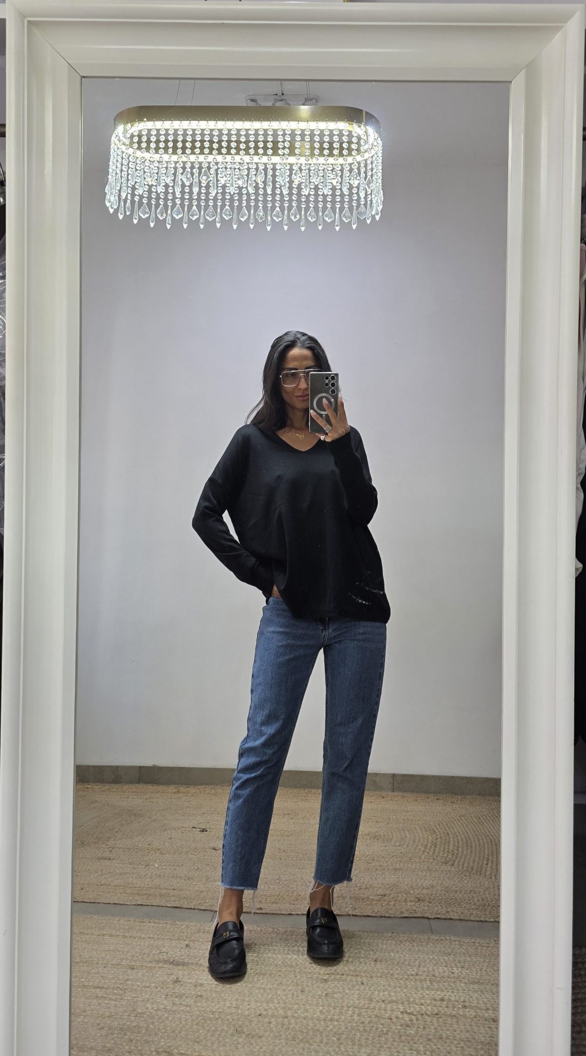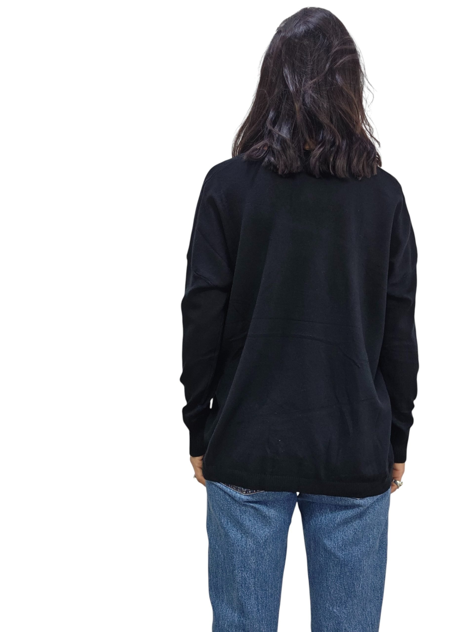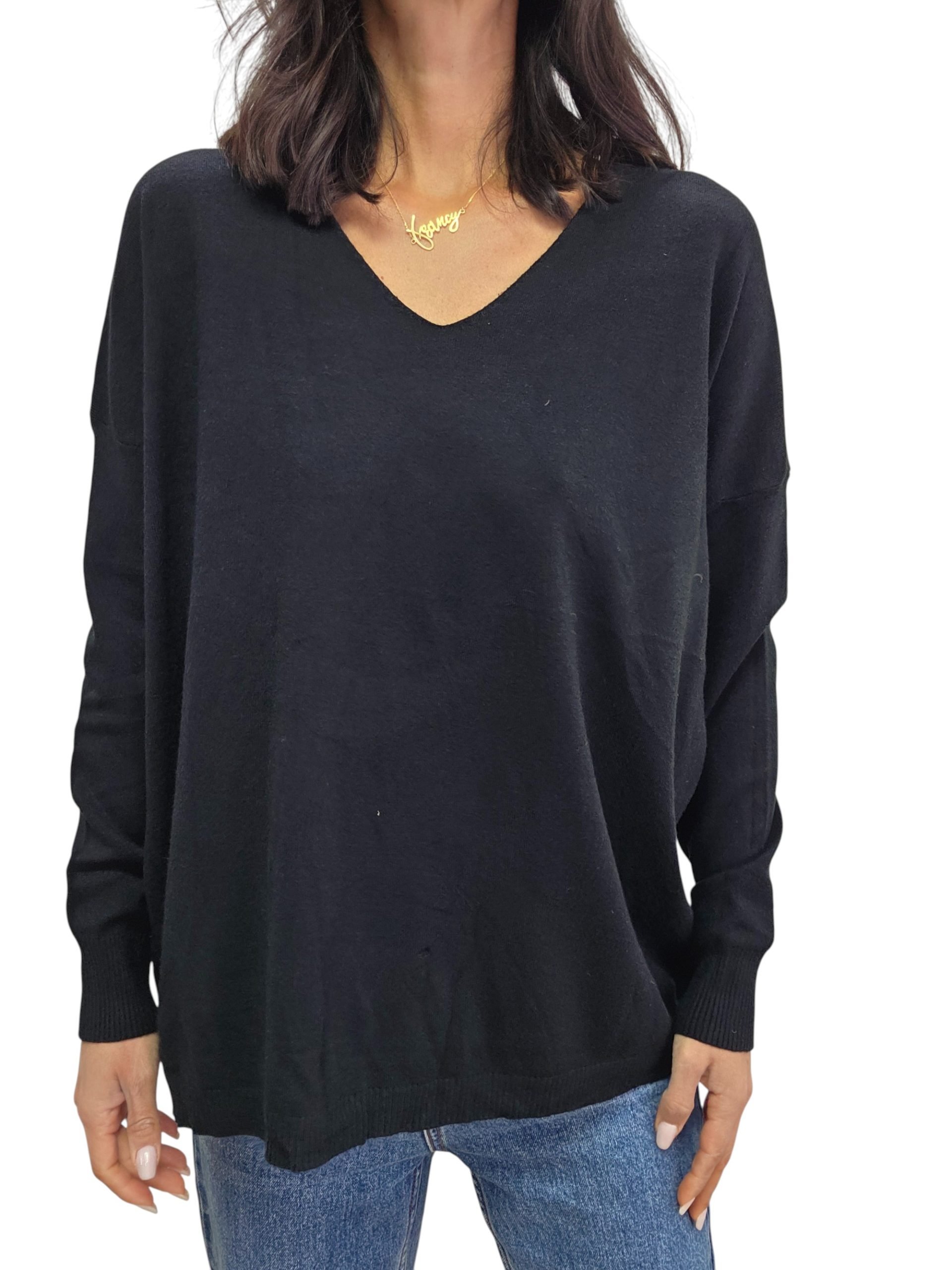 Pull con scollatura a V e vestibiltà comoda. Lunghezza media, taglia unica adatta a vestire fino a una taglia 48. Basic e comoda adatta a tutti i look.