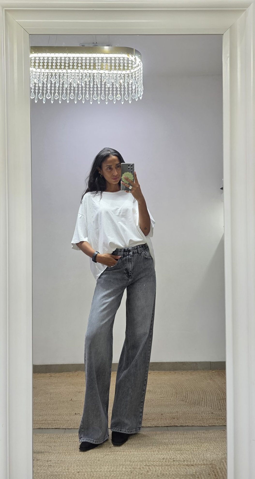 T-shirt modello over con lunghezza ,media. Girocollo manica corta . Taglia unica adatta a vestire fino a una taglia 48. Brand Please made in Italy. Bestseller adatta a tutti look per tutto l’anno.
