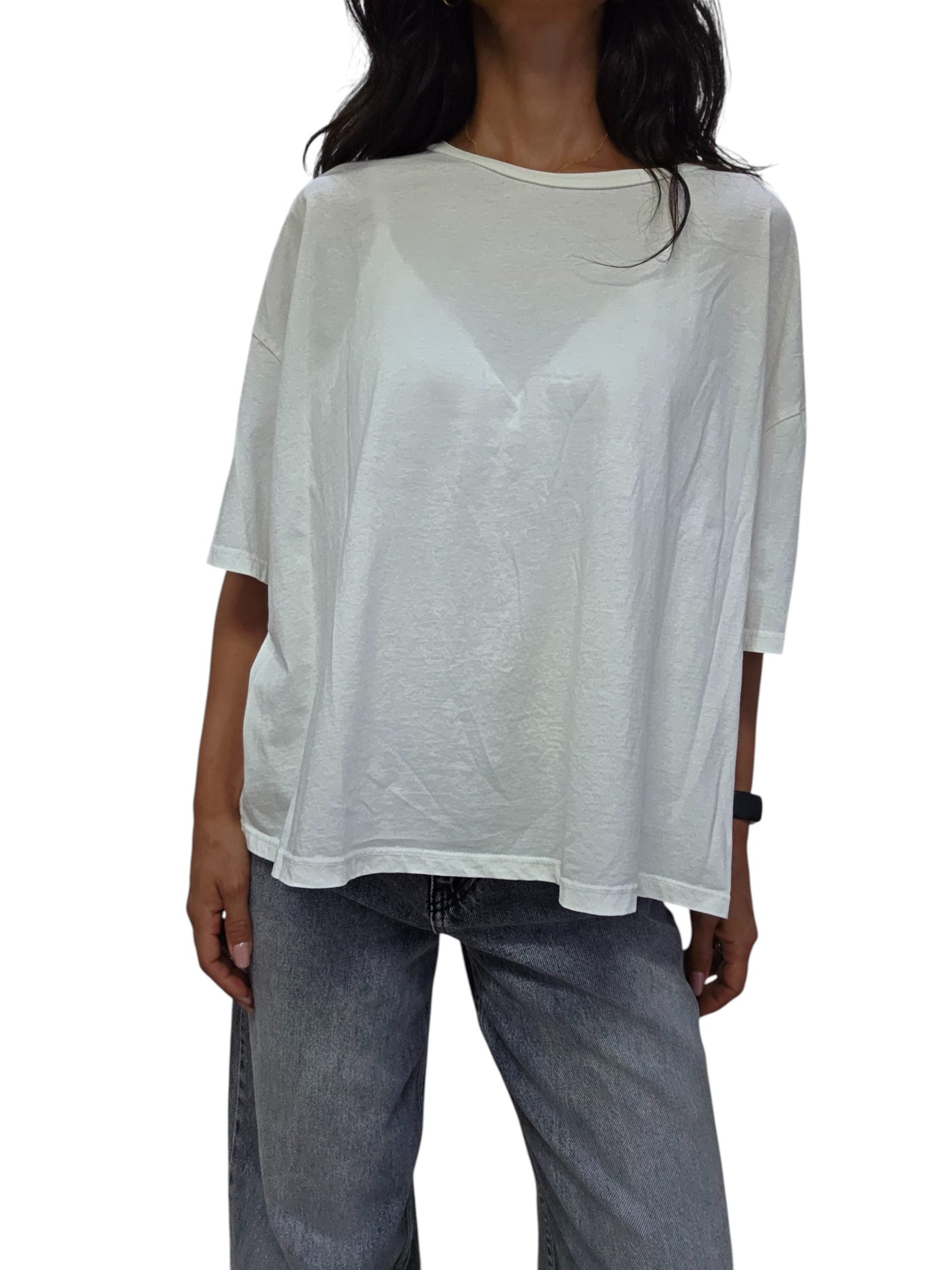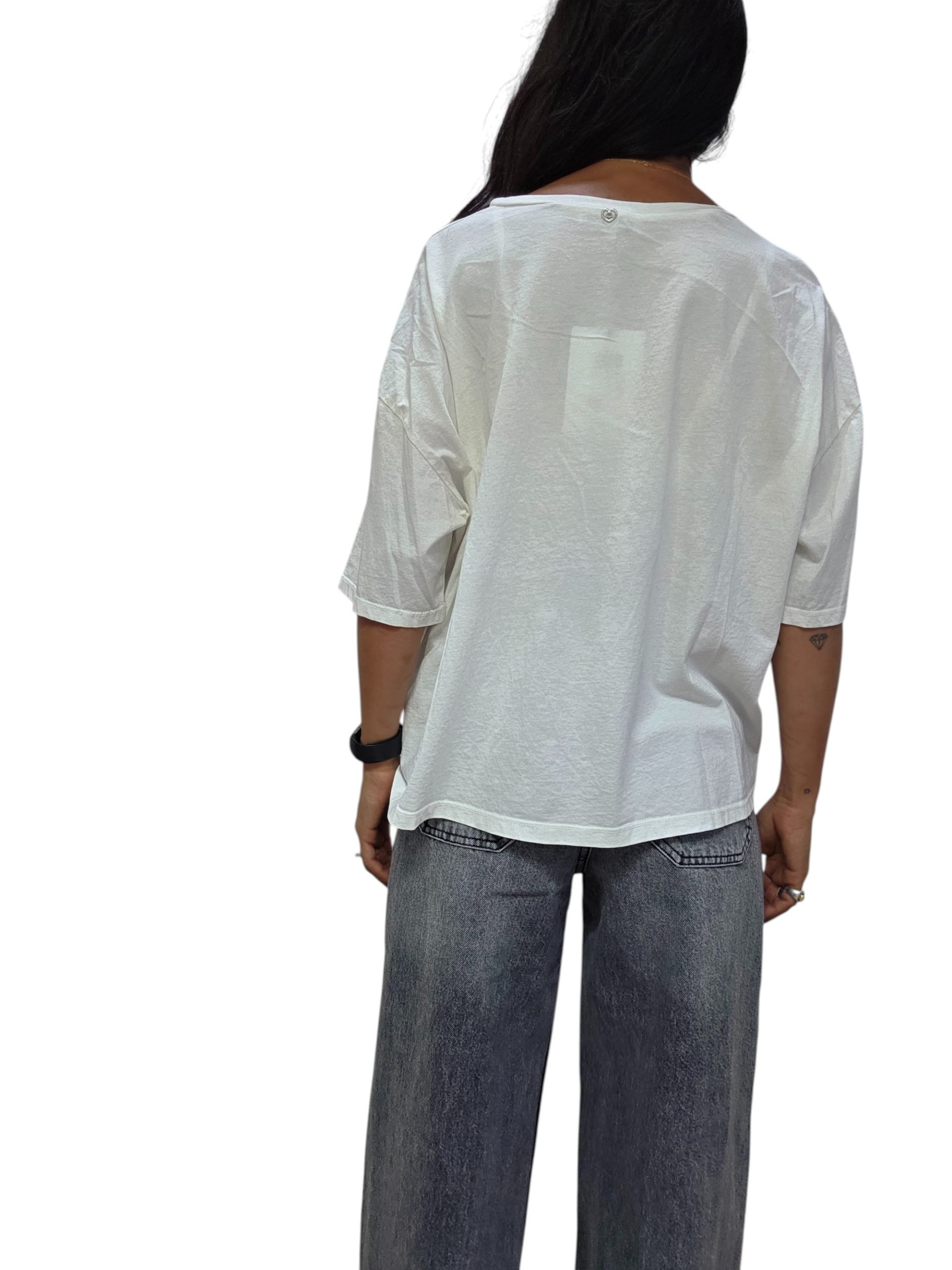 T-shirt modello over con lunghezza ,media. Girocollo manica corta . Taglia unica adatta a vestire fino a una taglia 48. Brand Please made in Italy.