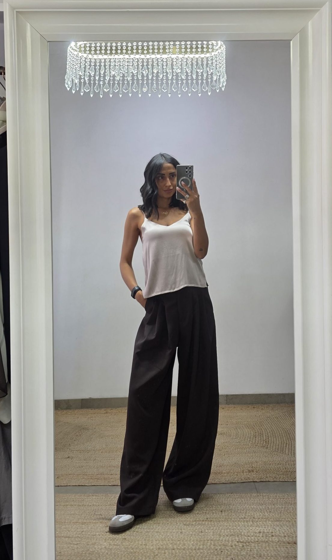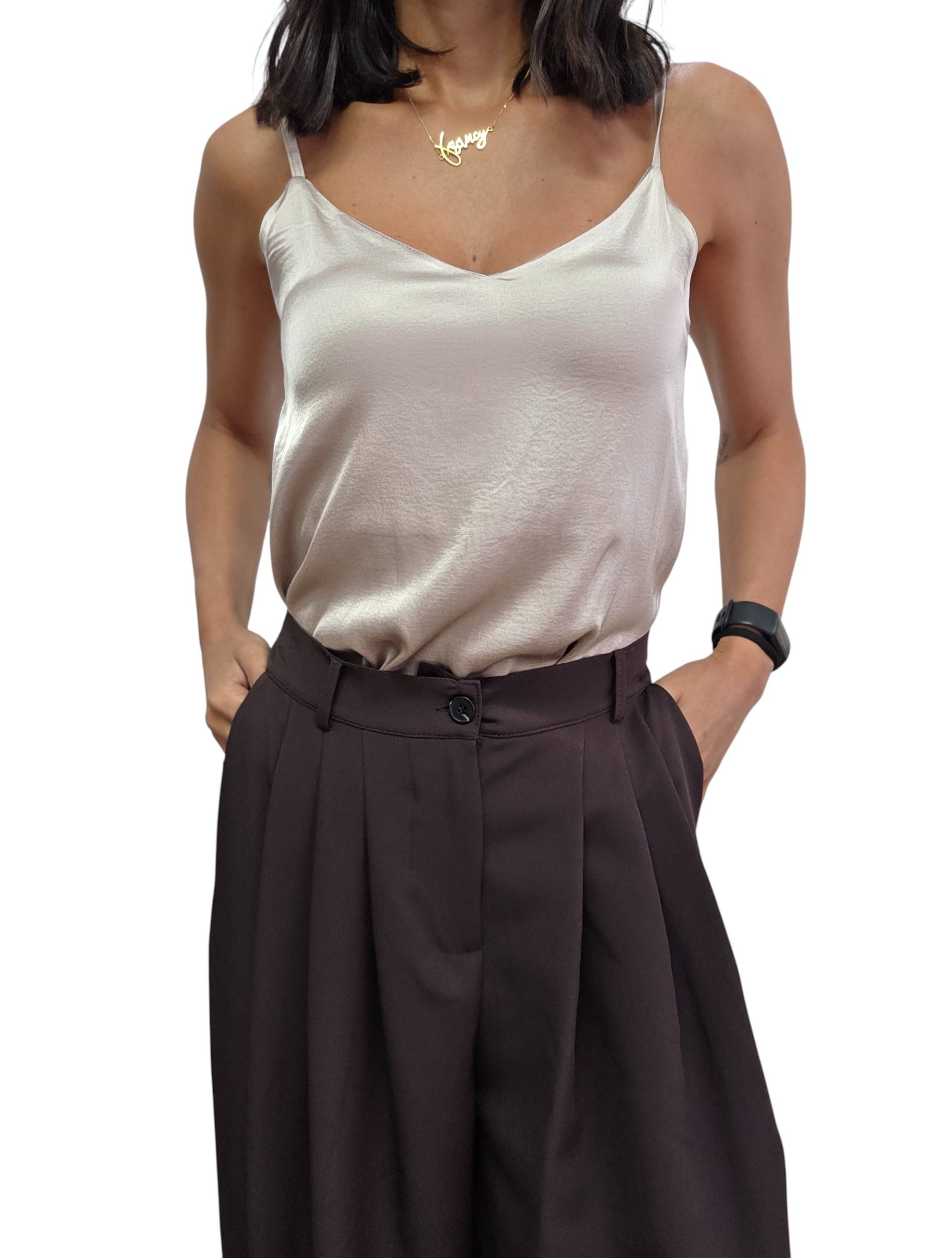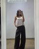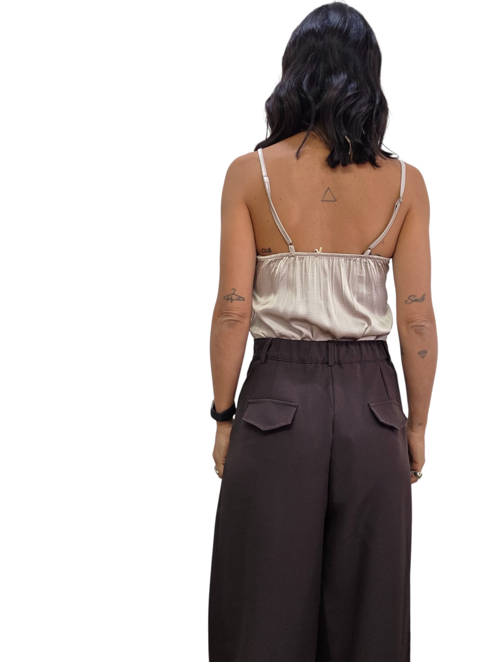 Pantalone palazzo con chiusura classica con bottone e zip e elastico nella parte posteriore della vita. Pences. Vita regolare, taglia unica adatta a vestire fino a una taglia 48. Pantalone basic e adatto a tutte le occasioni.