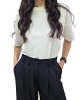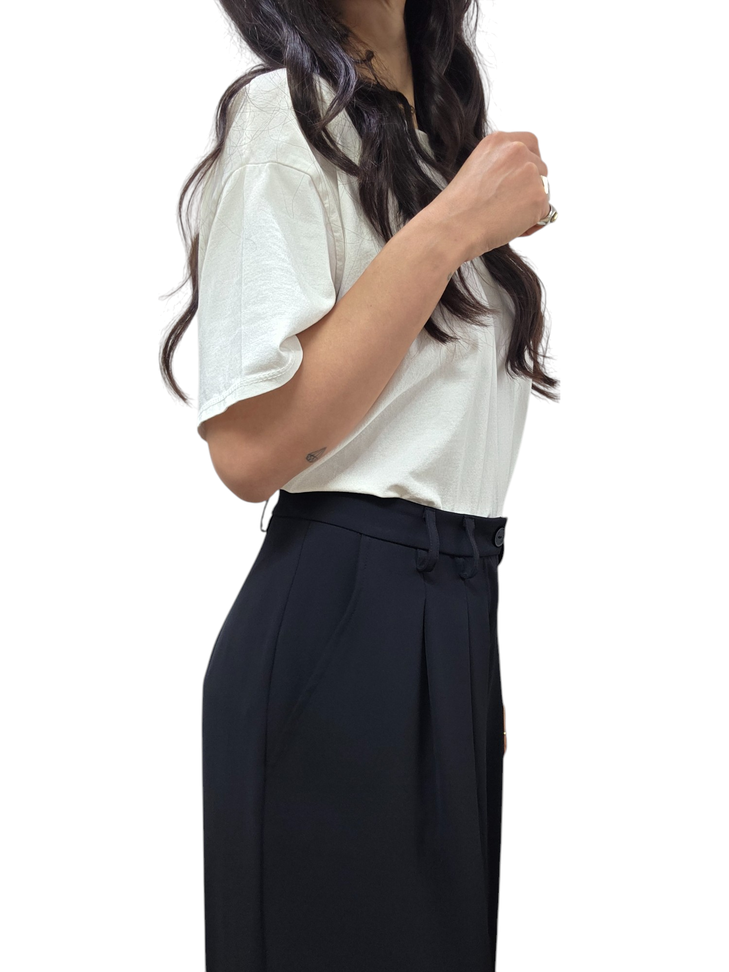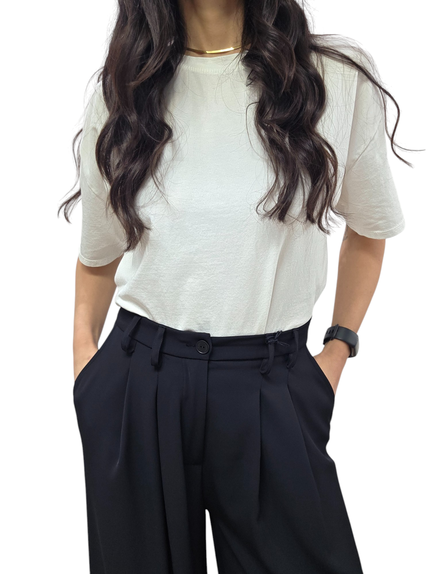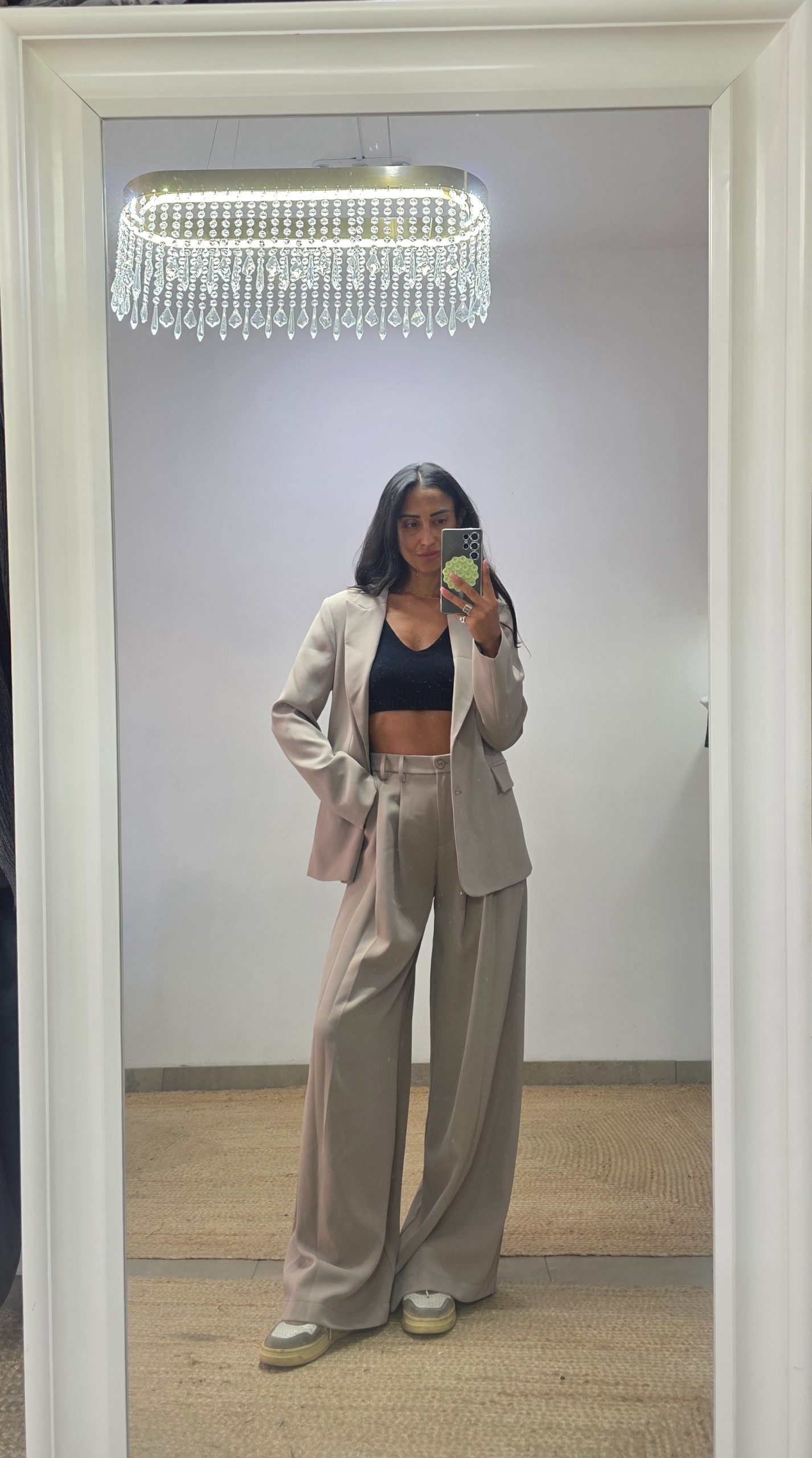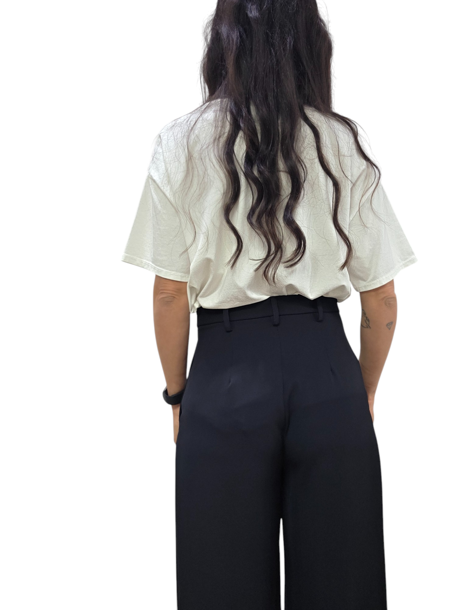Pantalone dal tessuto fluido e dal taglio sartoriale, modello palazzo. Vita alta con chiusura classica con bottone e zip e pences. Tessuto non elasticizzato. Vestibilità regolare. Brand Please, made in Italy. Pantalone classico che si adatta a look casual e eleganti.