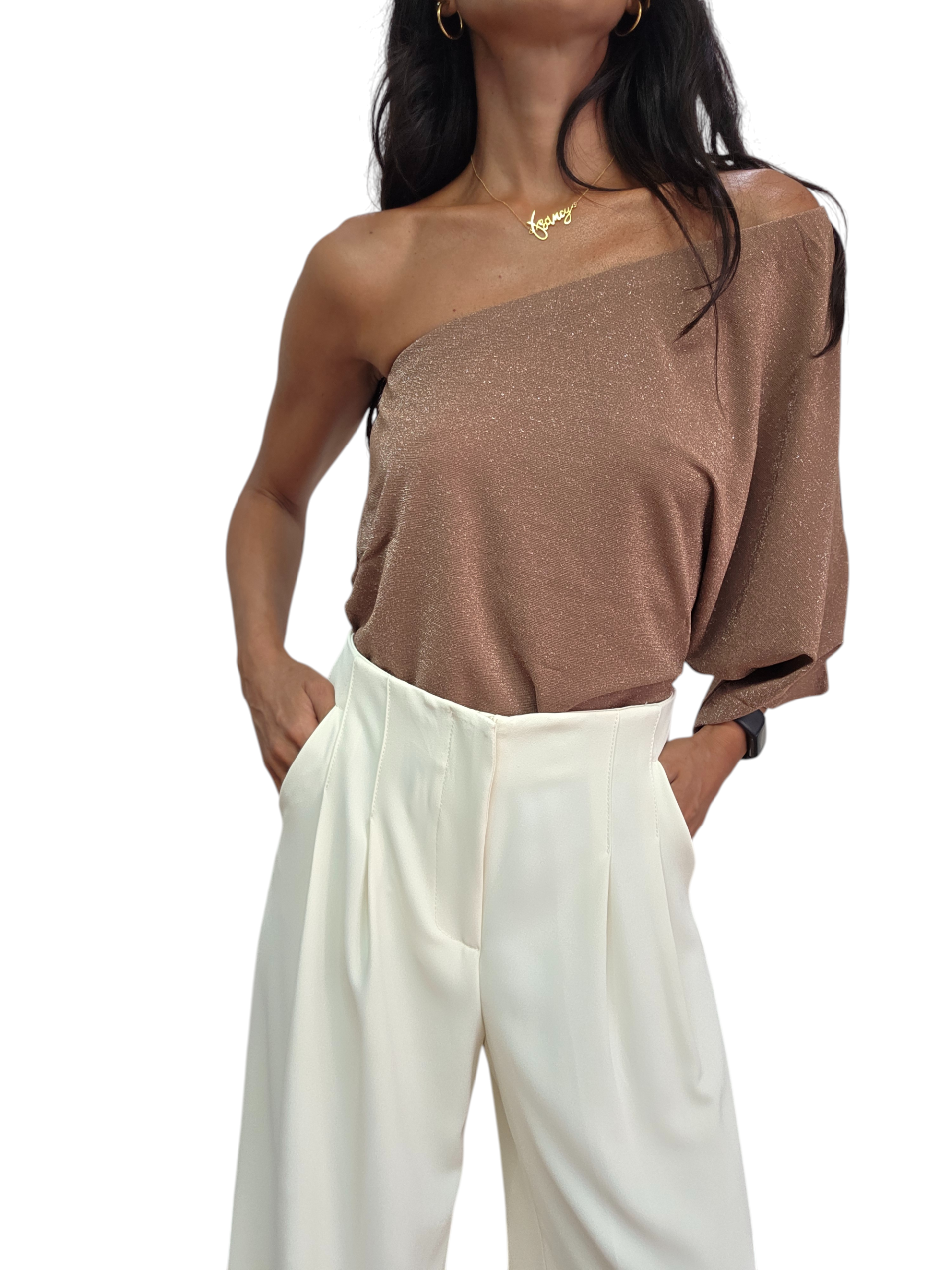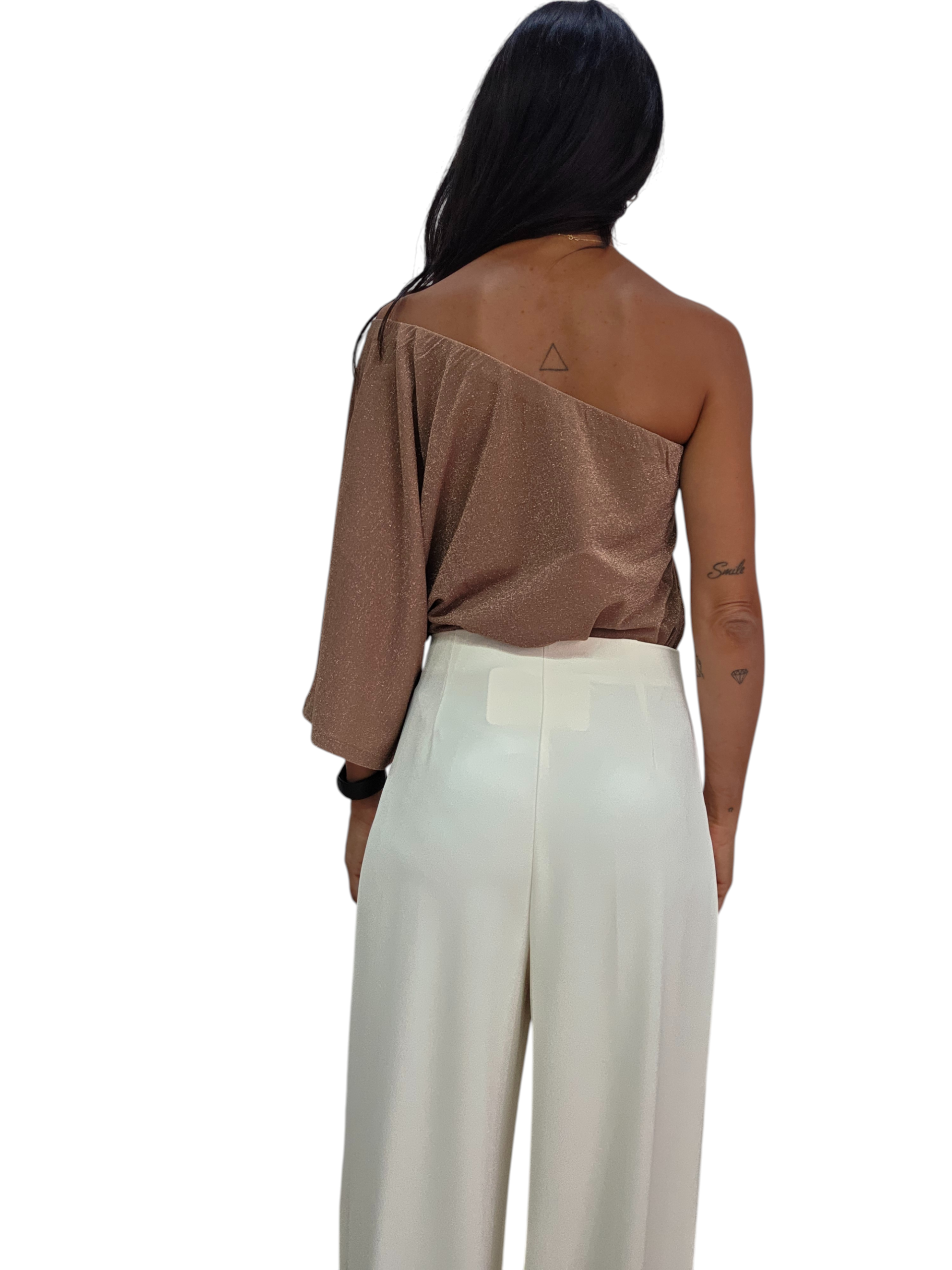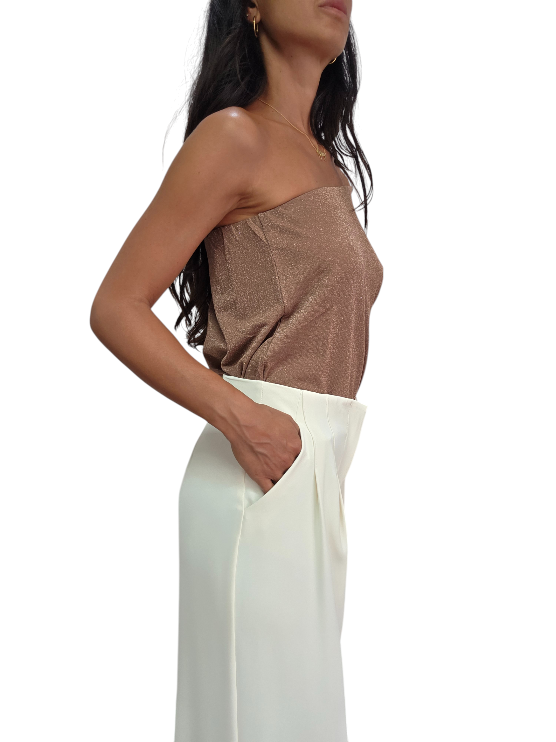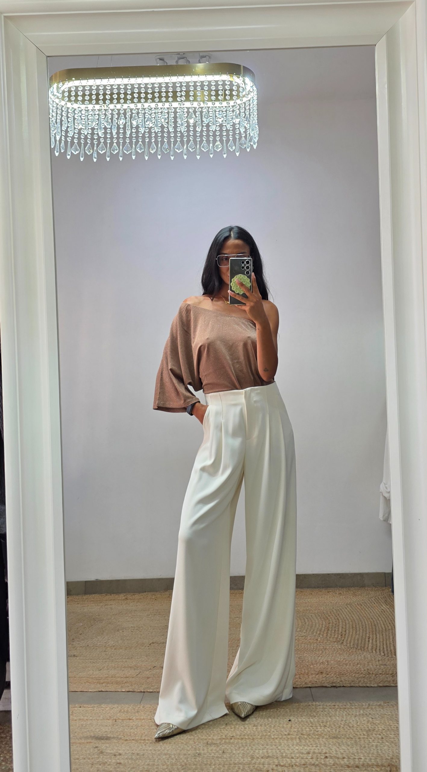 Pantalone modello palazzo dal taglio elegante e sartoriale. Vita alta con chiusura con bottone interno e zip. Tessuto leggermente elasticizzato con una vestibilità comoda . Brand Kontatto, ,made in Italy. Pantalone classico e chic perfetto per look eleganti e da ufficio.
