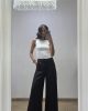 Pantalone modello palazzo vita alta con chiusura classica con zip e bottone. Vita con passanti rivestita in raso e banda laterale sempre con dettaglio raso. Nero con sottile dettaglio gessato. Vestibilità leggermente comoda, brand Please, made in Italy. Pantalone magnifico perfetto anche per look da cerimonia.