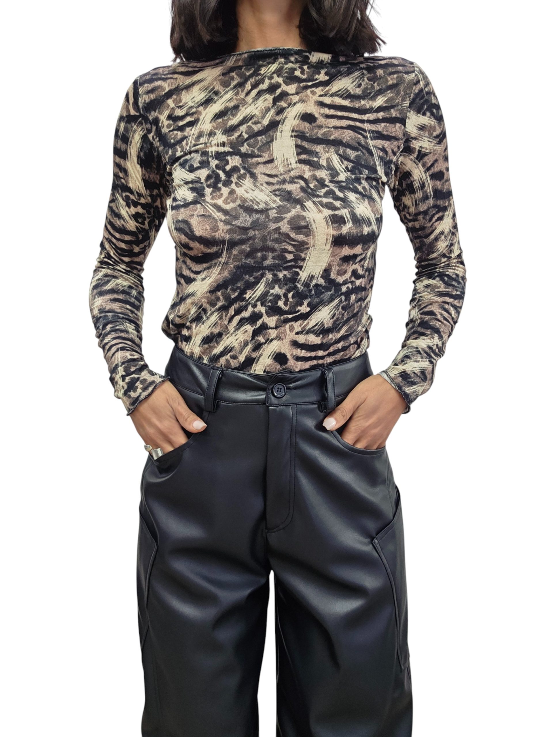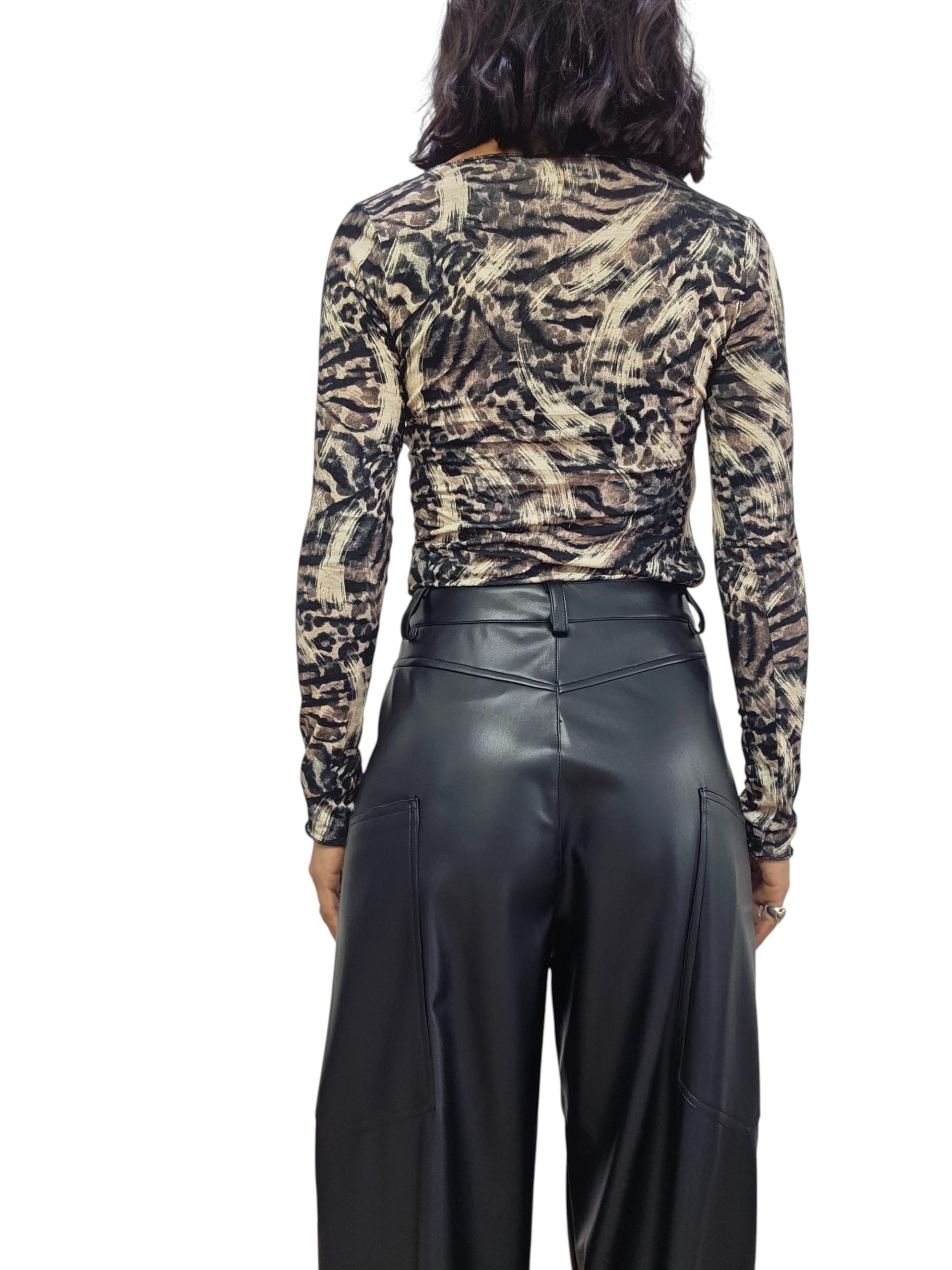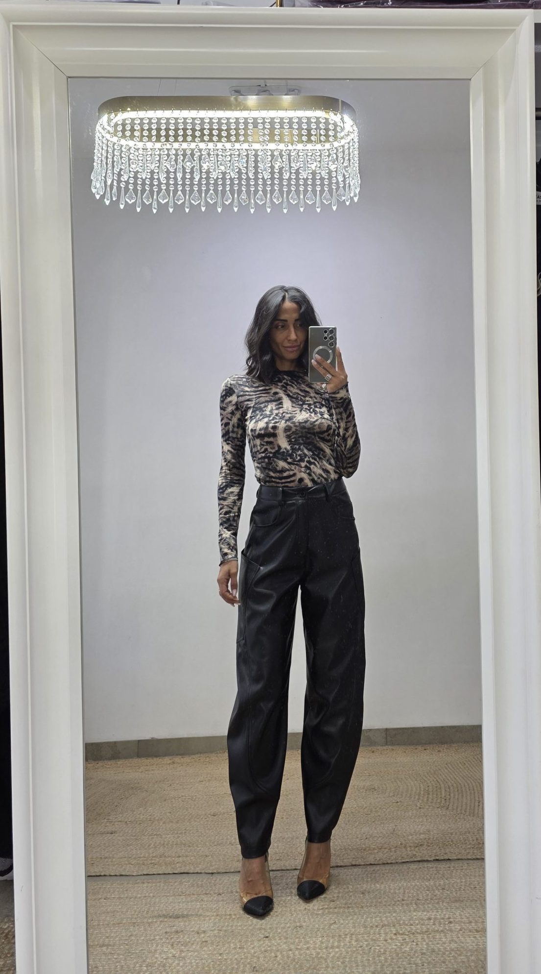 Pantalone in ecopelle modello baloon con effetto palloncino quindi ampio sulla gamba e leggermente più stretto sulla caviglia. Tessuto comodo , chiusura con bottone e zip. Vestibilità regolare. Brand Kontatto, made in Italy. Pantalone di gran tendenza adatto a tutti i look.