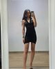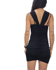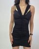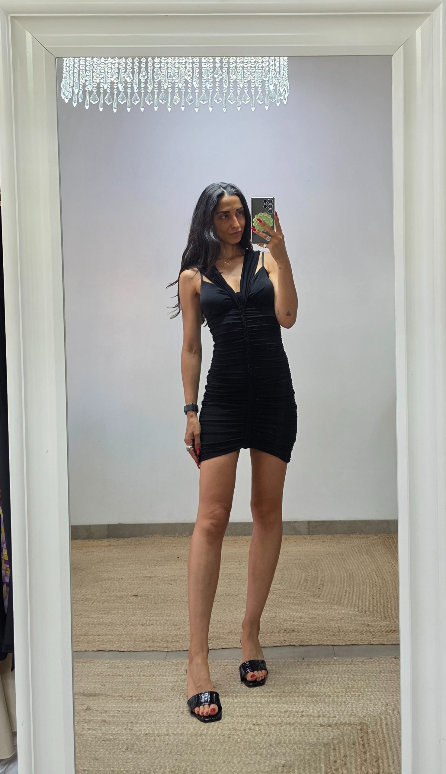 Minidress in tessuto elasticizzato con vestibilità aderente . Bretelline sottili regolabili . Effetto arricciato con particolarità tessuto intrecciato sul davanti. Taglia unica adatta a vestire fino a una taglia 48. Brand Kontatto, made in Italy. Minidress adatto a look glam da sera.