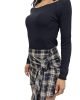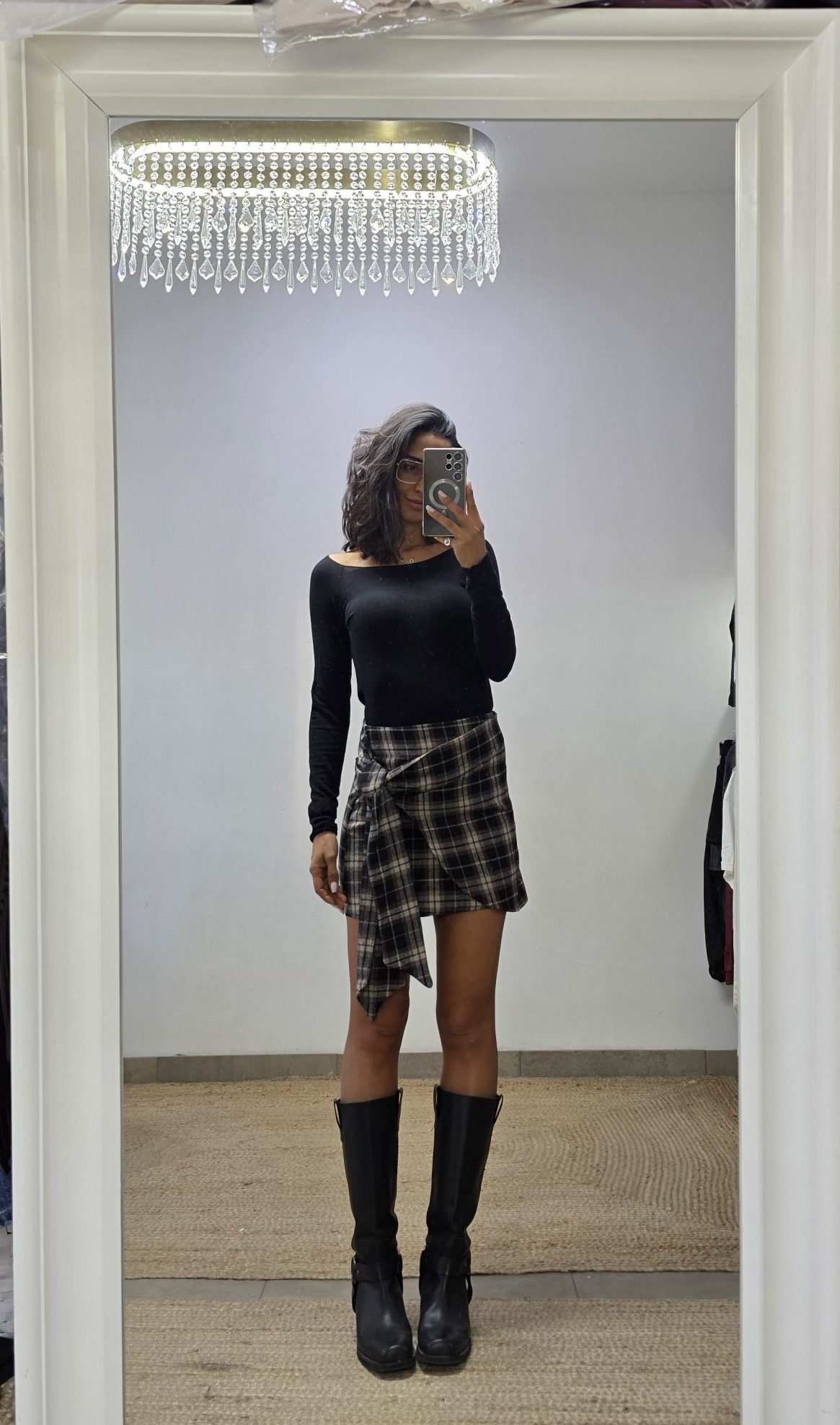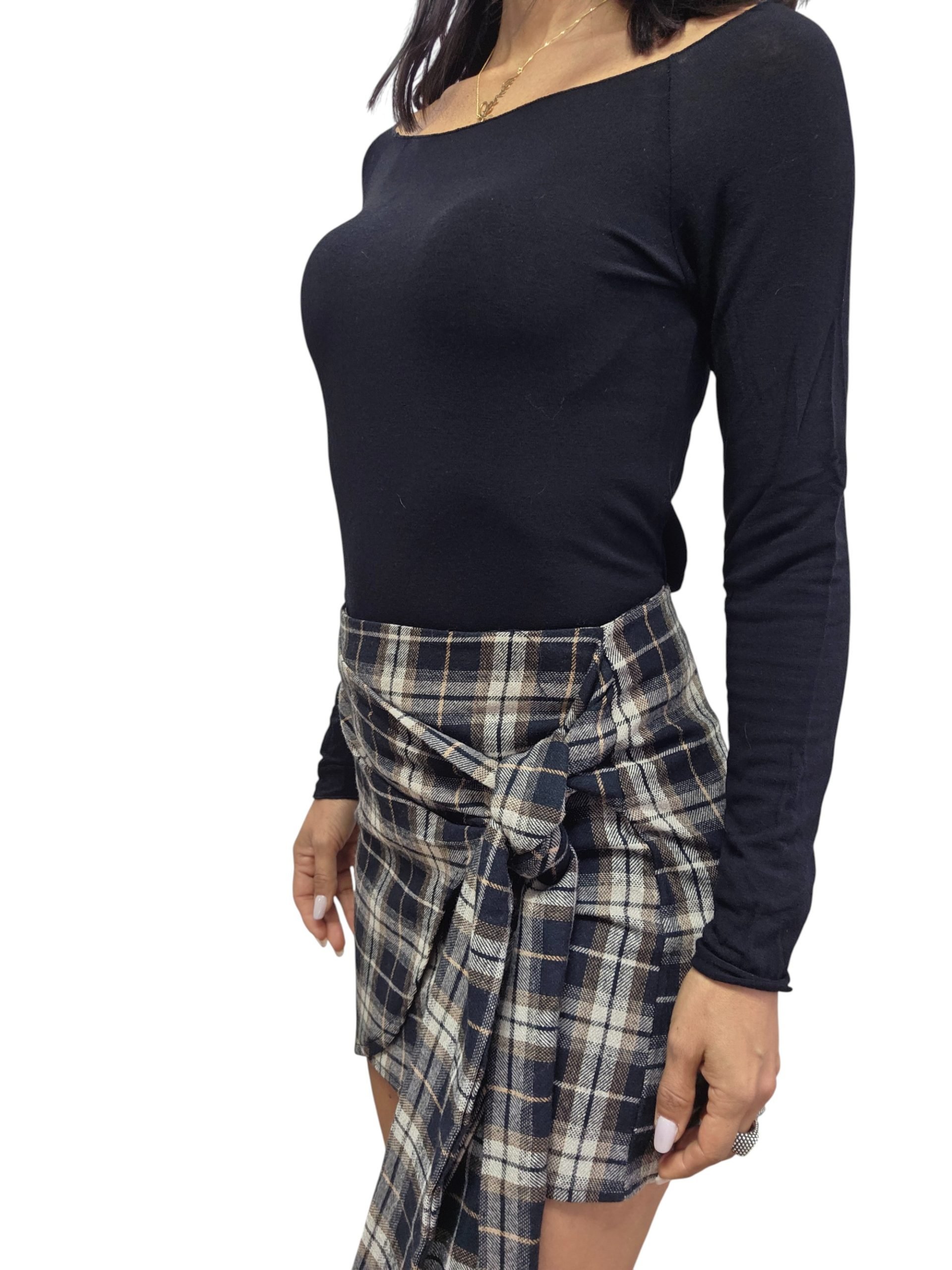 Minigonna con effetto nodo sul davanti. Tessuto non elasticizzato con chiusura con zip laterale. Stampa quadri. Vestibilità aderente. Adatta a look stilosi.