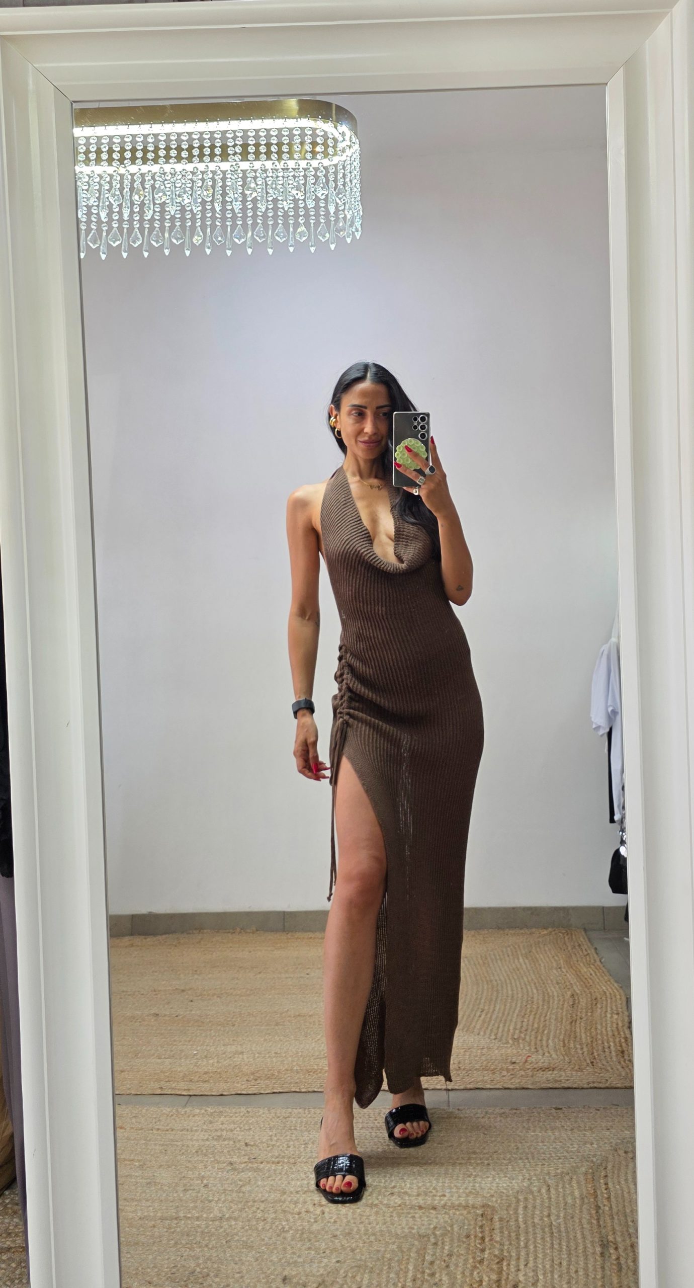 Abito in maglia con scollatura morbida profonda che passa dietro il collo . Schiena nuda. Lungo fino alla caviglia con spacco profondo laterale con arricciatura che si regola con laccetto. Vestibilità aderente ma con tessuto comodo e elasticizzato. Taglia unica adatta a vestire fino a una taglia 46. Abito perfetto per i nostri look estivi.