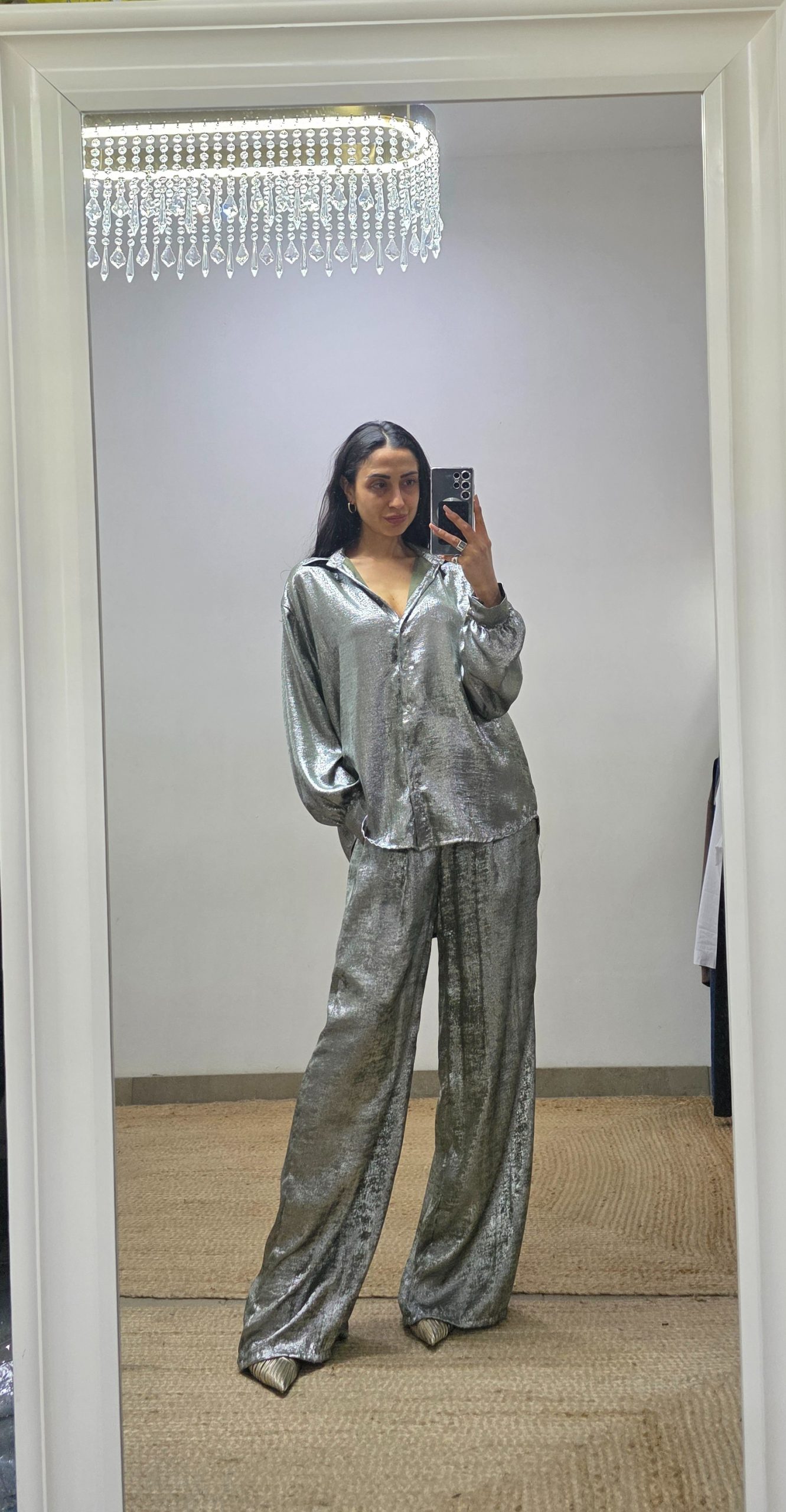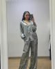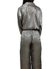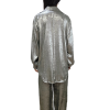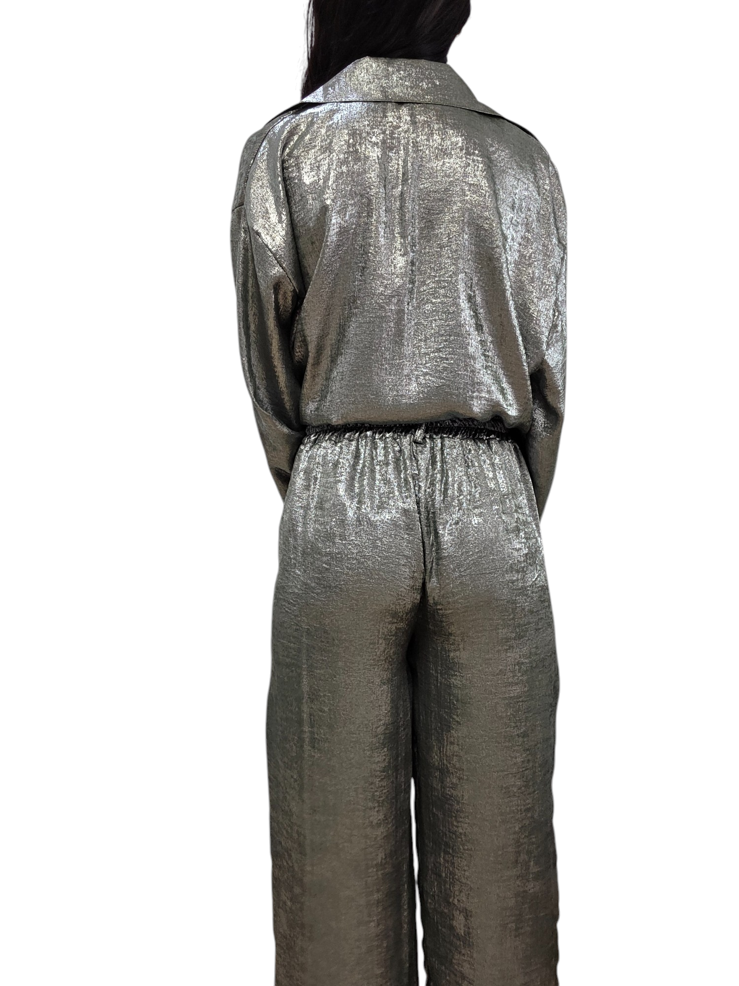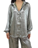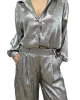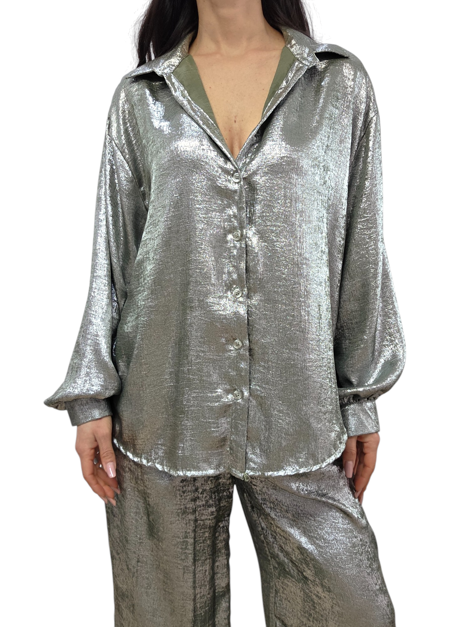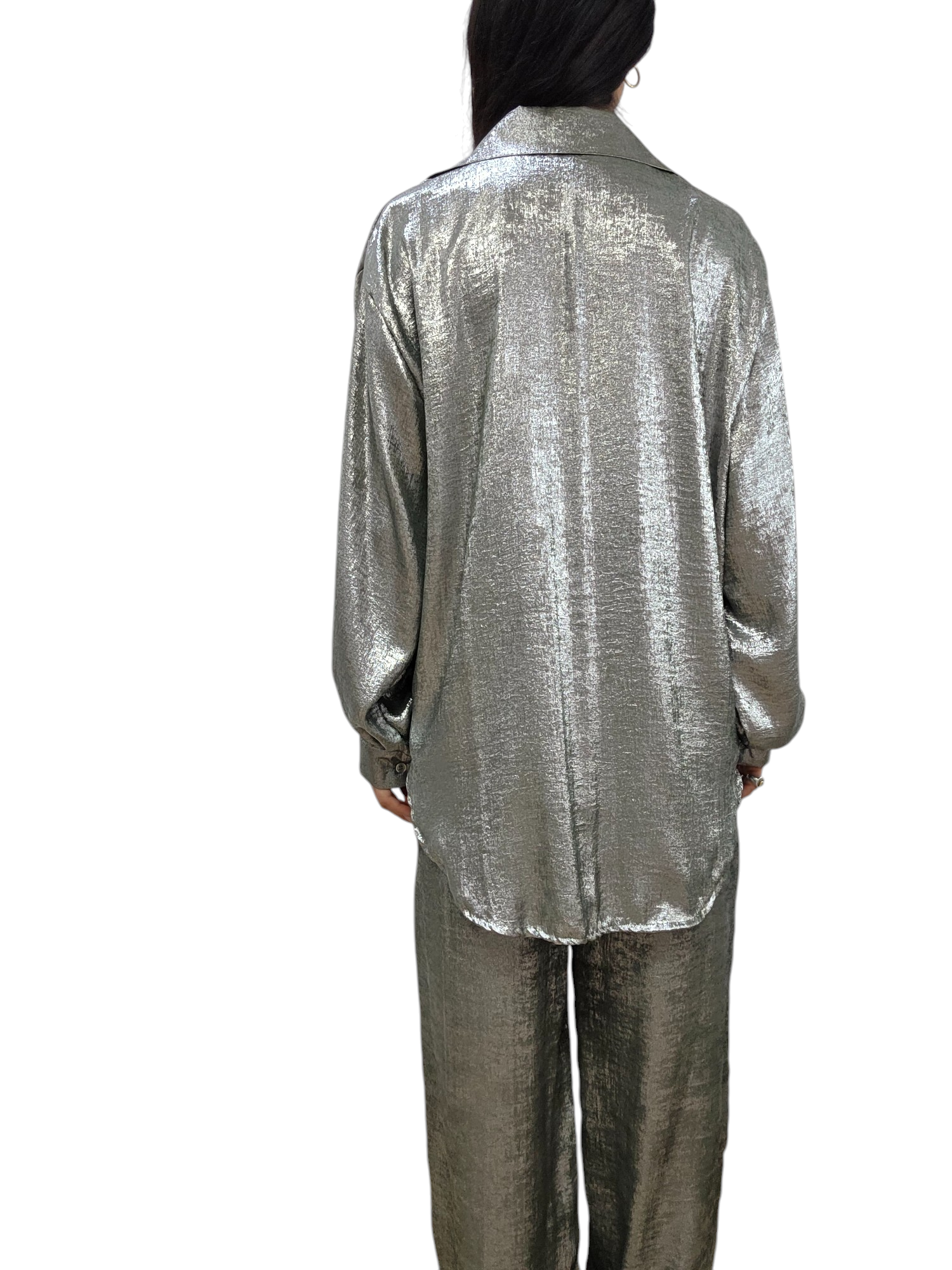 Completo in tessuto leggero con effetto spalmato composto da camicia dal taglio over con chiusura classica con bottoni, lunghetta medio/lunga , più lunga nella parte posteriore. Pantalone modello palazzo con elastico in vita e vestibilità comoda. Taglia unica adatto a vestire fino a una taglia 48. Completo adatto a look eleganti e casual/chic.