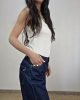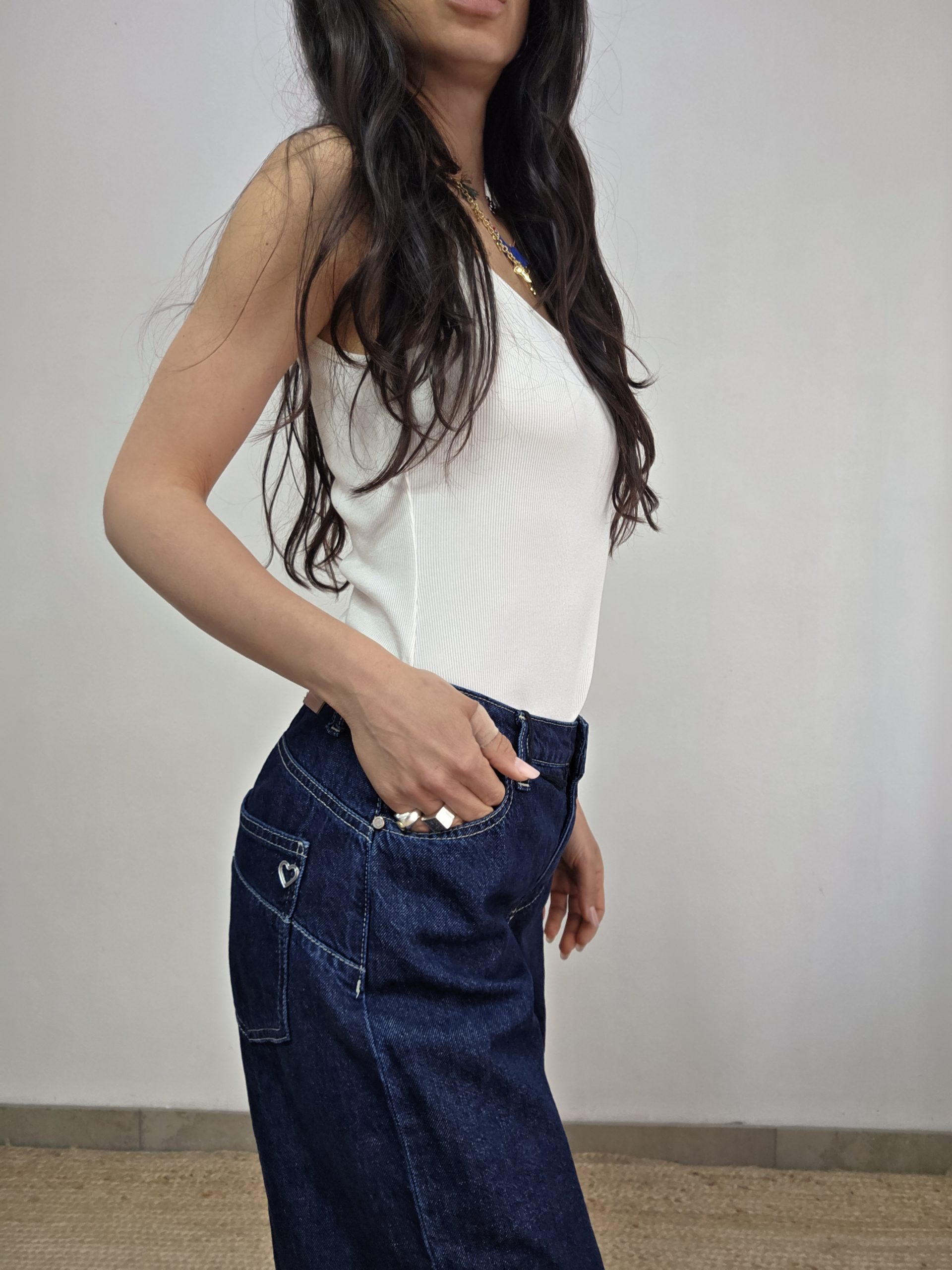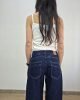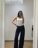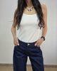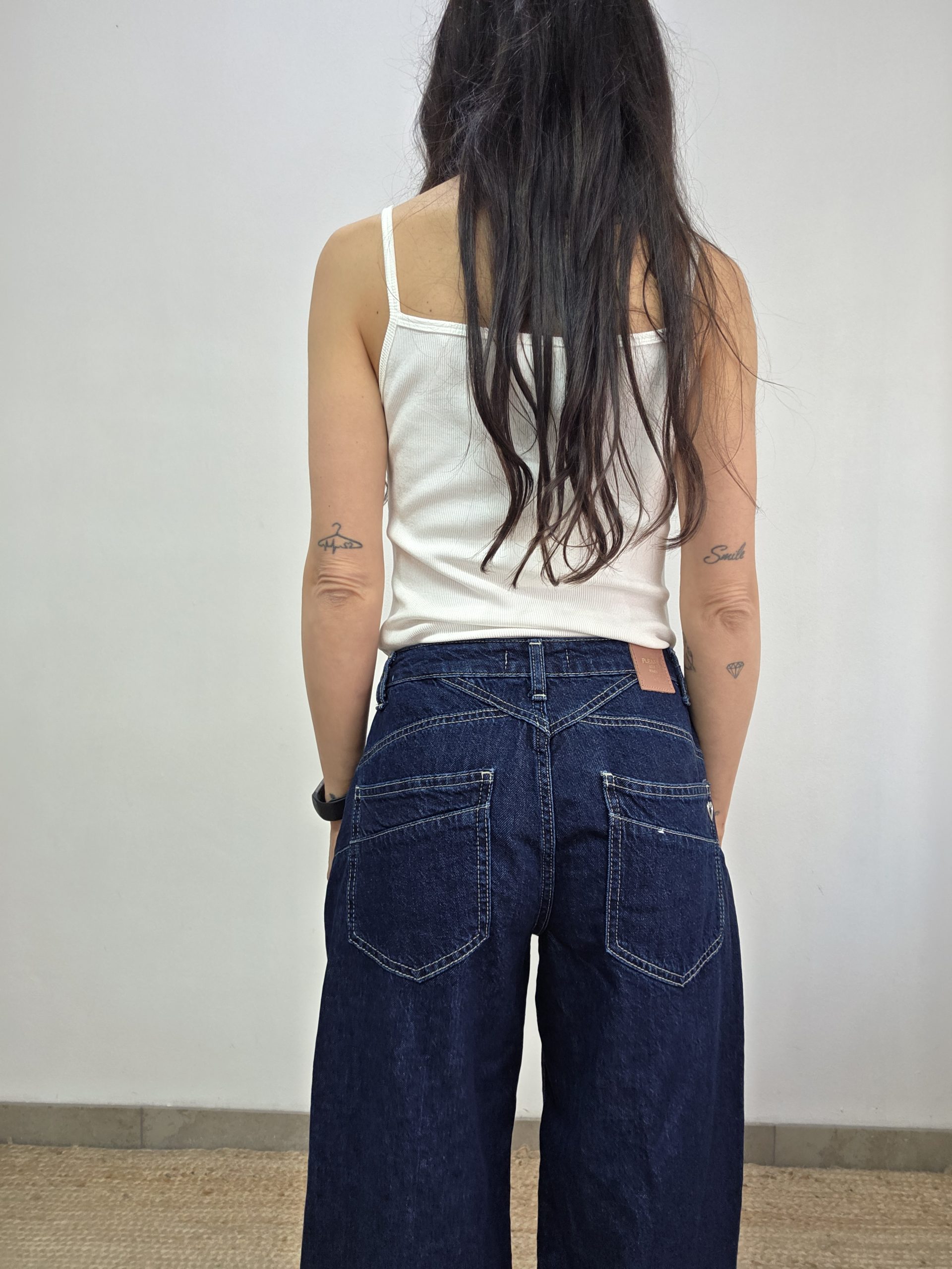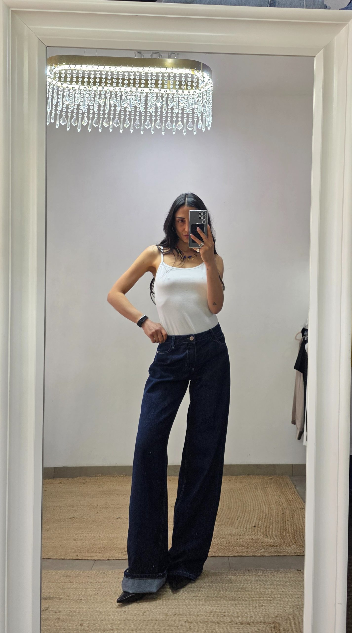 Jeans modello palazzo in blu denim con tessuto leggero e leggermente elasticizzato. Vita bassa con vestibilità regolare che tende ad ammorbidirsi portandolo. Brand Please, made in Italy.
