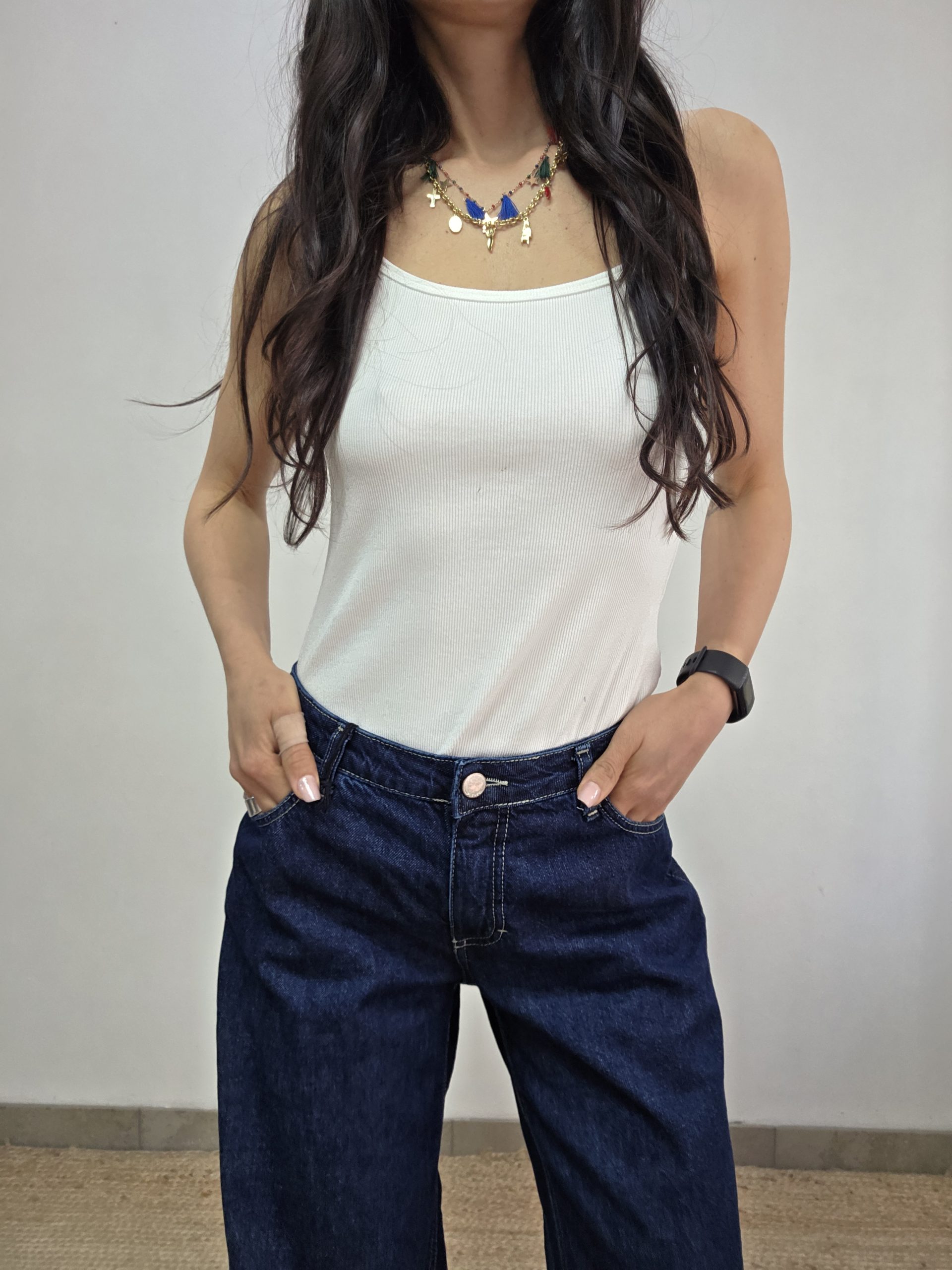 Jeans modello palazzo in blu denim con tessuto leggero e leggermente elasticizzato. Vita bassa con vestibilità regolare che tende ad ammorbidirsi portandolo. Brand Please, made in Italy. Un jeans casual e basic adatto a tutti gli stili.