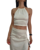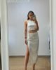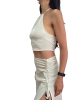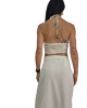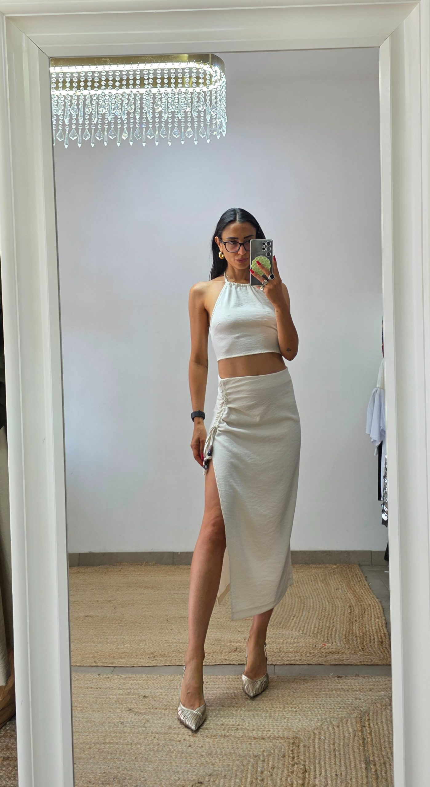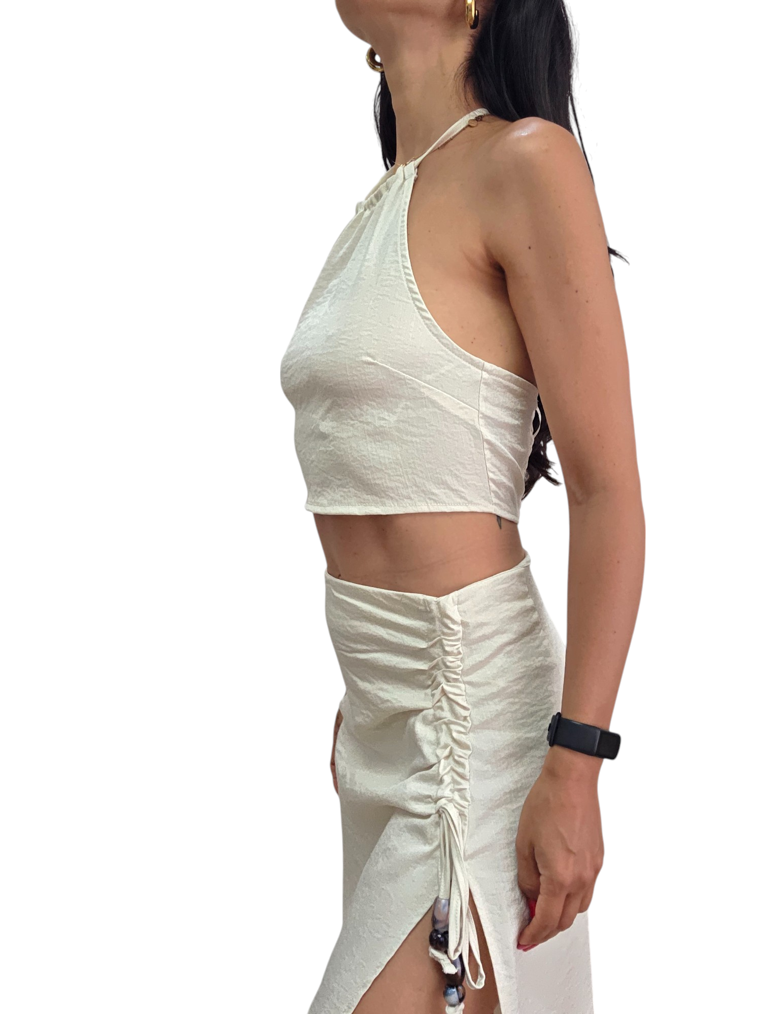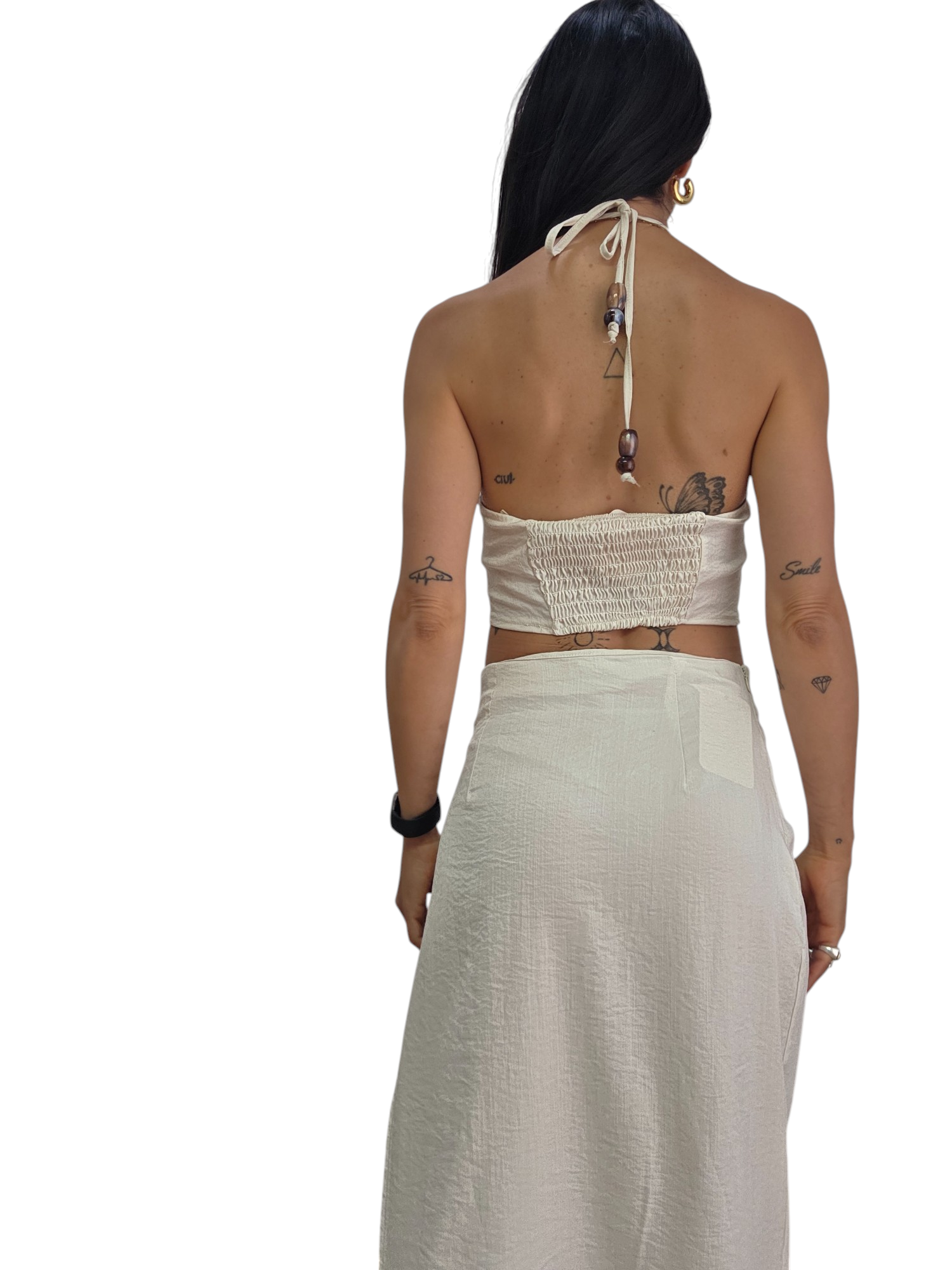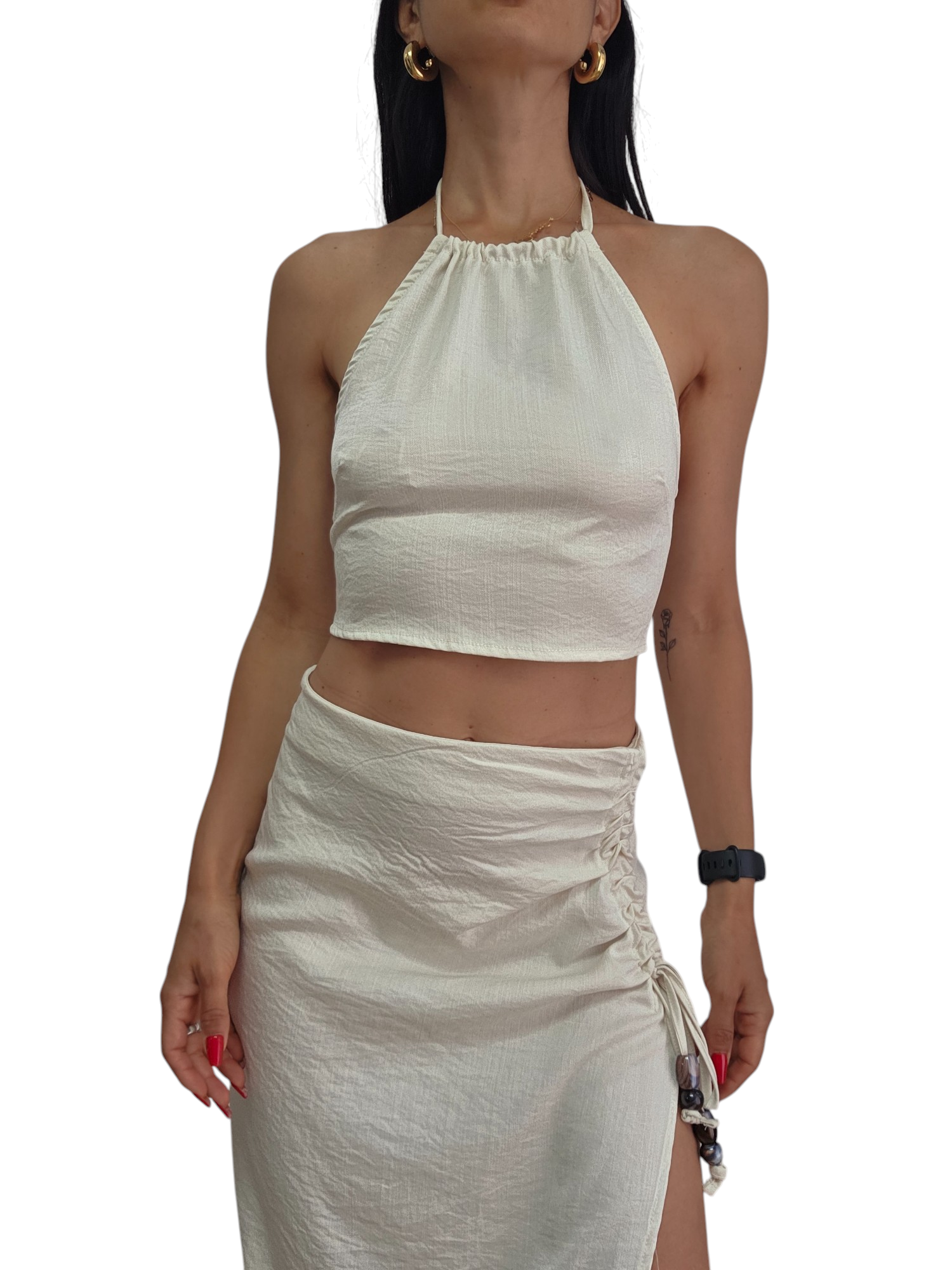 Top crop con scollatura all’americana che si allaccia dietro il collo con applicazione finali. Elastico dietro la schiena, tessuto non elasticizzato . Vestibiltà regolare. Brand Kontatto , made in Italy. Top perfetto da abbinare alla sua gonna o da indossare su pantaloni o jeans